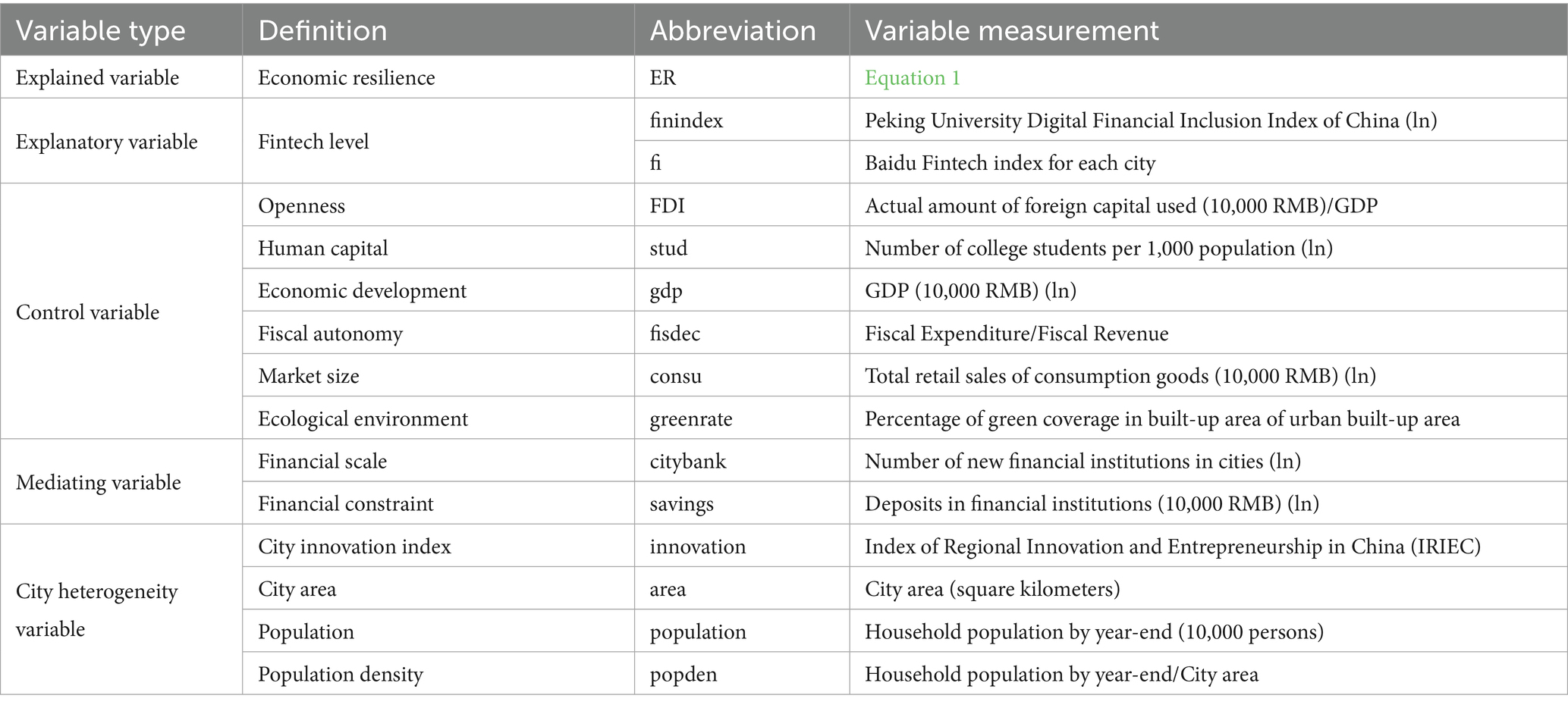 where i is the prefecture city, and t is the year. ER is the explained variable, economic resilience. is the constant term. Fintech is the core explanatory variable, i.e., the level of financial technology. X is the vector of control variables affecting economic resilience. is the individual effect, is the time effect, and ε is the random error term, which follows a normal distribution. is the crucial coefficient of this research, indicating the effect of financial technology on economic resilience. is the vector of coefficients of the effect of control variables on economic resilience.