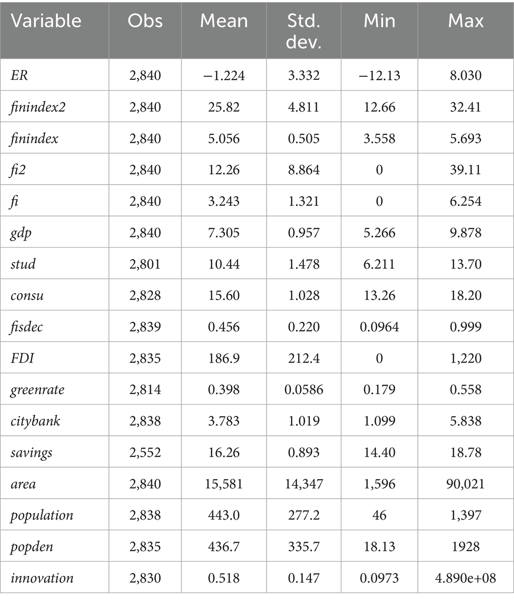 This study selects 284 prefecture-level cities2 in China as a case study to empirically assess the impact of Fintech on economic resilience. It uses the panel data of the 284 prefecture-level cities in China from 2011 to 2020 as the research sample. Economic resilience is calculated based on the GDP growth rate. Fintech data are from “the Peking University Digital Financial Inclusion Index of China.” The city panel data are obtained from each province’s China City Statistical Yearbook and the Statistical Yearbook. After excluding the missing sample variables, the final data of 284 prefecture-level cities was obtained, with 2,840 observations3 and a study period of 2011–2020. All data are logged, and the summary statistics are shown in Table 2. All data are winsorized by 1%. There is a significant deviation in economic resilience between cities. The data distribution is scientifically sound. To test for potential multicollinearity in the model, this study calculated the Variance Inflation Factor (VIF) for the control variables. The results show that all variables have VIF values below 10, with an average VIF of only 2.99, indicating that the model does not suffer from severe multicollinearity and that the regression estimates are reliable (Appendix).