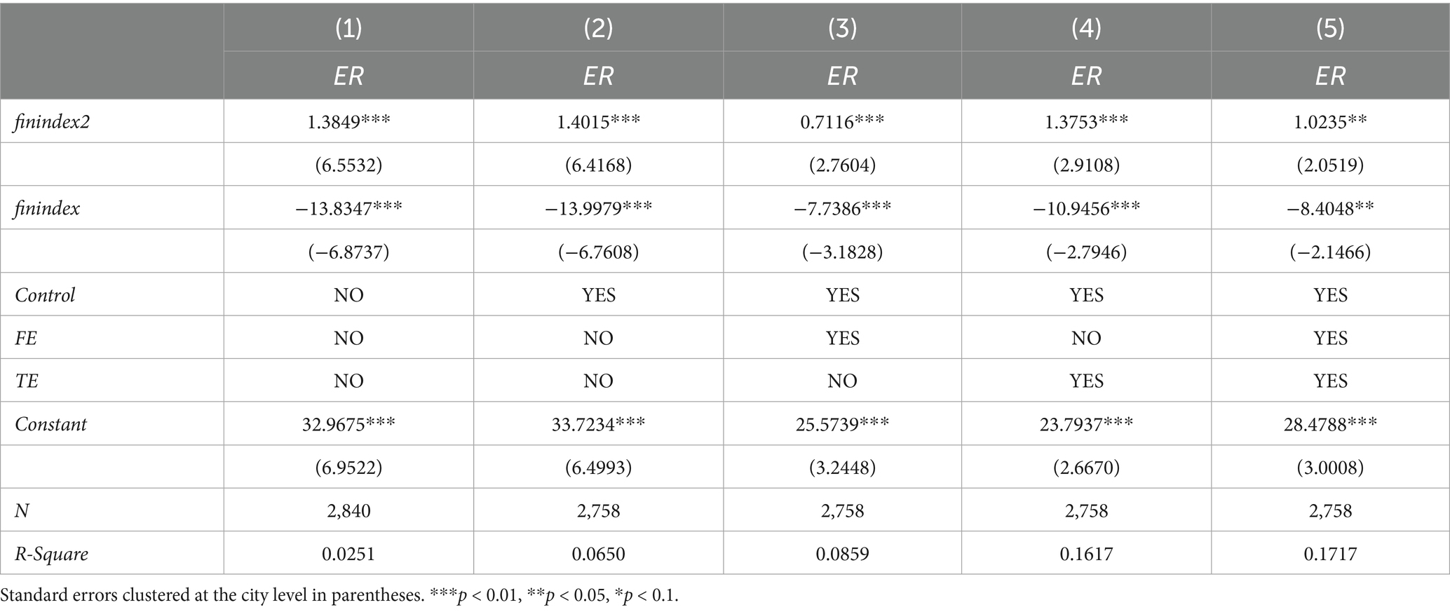 Table 3 presents the results of the benchmark regression, revealing a U-shaped relationship between Fintech development and economic resilience. Specifically, Fintech exerts a negative impact on economic resilience when its level is below 61.41, but a positive one when the level exceeds 61.41. Within our sample, 215 observations (7.57%) fall below this threshold, suggesting that for 92.43% of cities, Fintech development enhances economic resilience.