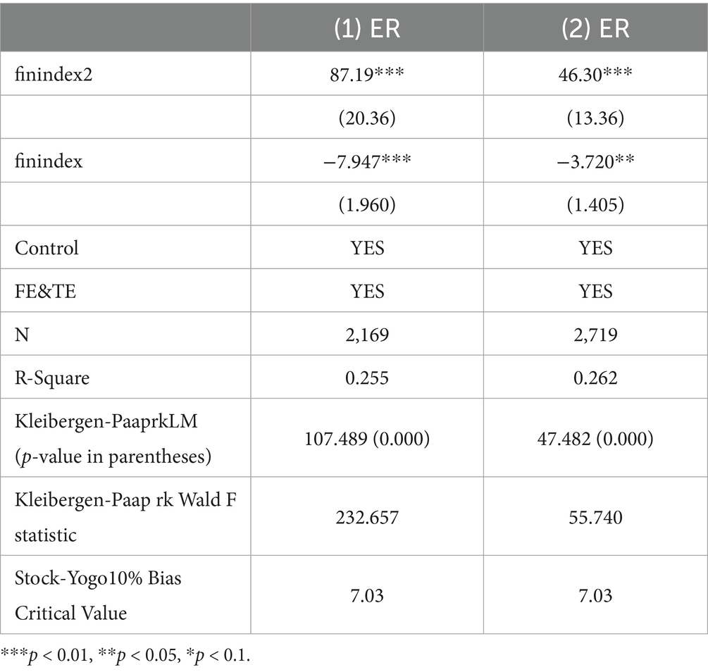 To address potential endogeneity concerns, we employed the instrumental variable (IV) approach. In Table 5, Column (1), we used the second-order lag of Fintech (lagged two periods) as the instrumental variable, while in Table 5, Column (2), we used the provincial average level of Fintech as the instrument.