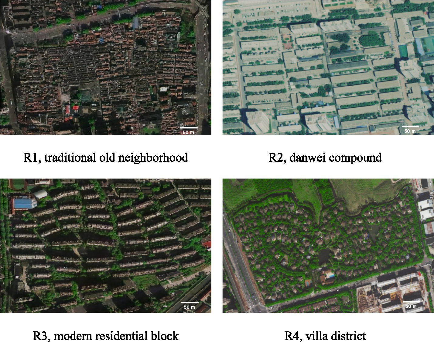 Since the marketization of housing, high-end villa districts often labelled with ‘garden city’ or ‘eco-city’ began to gain popularity among more affluent individuals. These promise a more luxurious living experience with access to open space, privacy, and connection to ‘nature’ (Sun, 2015). Local governments initially welcomed the construction of these developments for financial gain and for their supposed environmental benefits. Growing concerns about the negative environmental impact of such developments, including land abuse and damage to natural ecosystems, has led many cities to strictly control the construction of this type of development more recently. Figure 2 shows a long-established traditional neighborhood (R1), a danwei-style compound constructed during 1990s (R2), a modern high-rising block developed in 2012 (R3), and a villa district constructed in 2006 (R4).