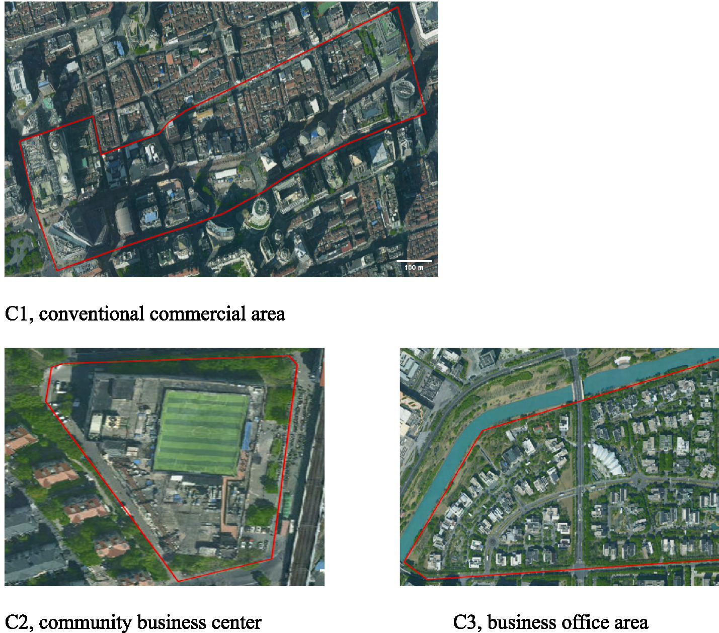 From around the 1990s, a new type of business and commercial development known as “business office areas” or “商务办剬区,” characterized by a concentration of office buildings, began to emerge. Like modern industrial zones (often located in close proximity), these business office zones are planned systematically in suburban or rural areas. Figure 4 shows a large commercial area evolved from a historic commercial street dating back to the 1860s (C1), a community commercial center constructed around 2006 (C2), and a business office zone which became operational around 2012 (C3).