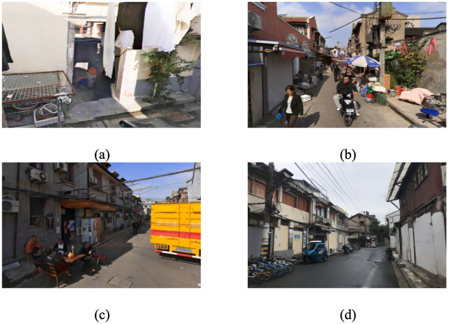 (a) Poor drainage and road design, noteworthy elevation gap inside and outside at a household’s gate; (b) encroachment of public space; (c) people socialize in the compacted space; (d) a street after relocation. Taken by the author.