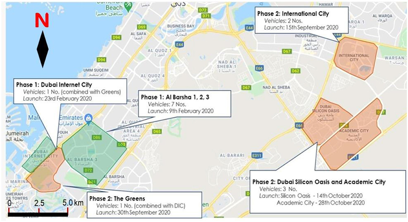 The pilot project in Al Barsha (Service Area 1) and Dubai Internet City (DIC) catalyzed meaningful progress toward the Roads and Transport Authority's (RTA's) ridership growth goals. The project's expansion to three additional service areas, namely Dubai Silicon Oasis (Service Area 2), The Greens, International City, and (with inter zonal connectivity to the Dubai Academic City), provided additional FLM access to fixed-route services, particularly for those who live in areas difficult to serve with traditional fixed-route bus and metro services (see Figure 2). Although services in DIC and The Greens were discontinued due to the COVID-19 pandemic, the BOD initiative has since evolved, and it remains operational in select areas, including expansions into new areas (Business Bay and Al Nahda), supported by continuous enhancements in digital booking, routing algorithms, and service coverage.