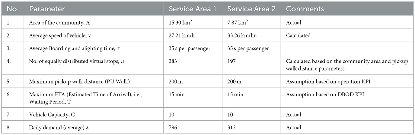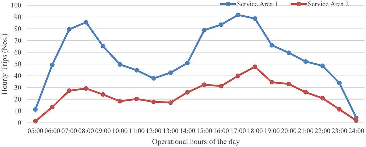 In this study, the empirical data for Service Areas 1 and 2 (see Table 1) are used for further analysis. The Service Area 1 comprises a 15.3 km2 area that provides FLM connection to the metro stations; many users also travel between home and leisure/work locations within the mixed-use zone, making it the most preferred reference community for further detailed analysis. Service Area 2, the Dubai Silicon Oasis, covering an area of 7.8 km2, also consists of intra-community travel without a metro head connection. The real-world operation data set from Service Area 1 has been utilized for the base-case scenarios, and the agency cost models developed in this study have been tested for Service Area 2 parameters.