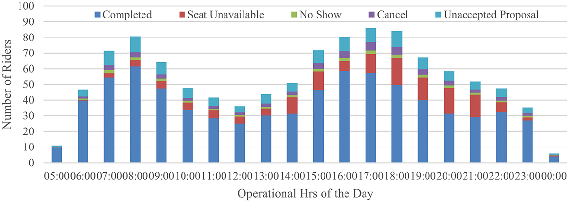 The other service characteristics for the two areas are presented in Figure 3, depicting the total demand and vehicle occupancy by time of day, averaged over the dataset available. The total demand in Figure 4 includes the completed rides as well as the demand that is not met, due to cancellations or other reasons. For both areas, as the demand varies by the hour, each day is broken down into 1-h time periods to capture the varying demand characteristics. The morning peak is observed approximately at 8 am, while the evening peak is captured between 5 and 6 pm.
