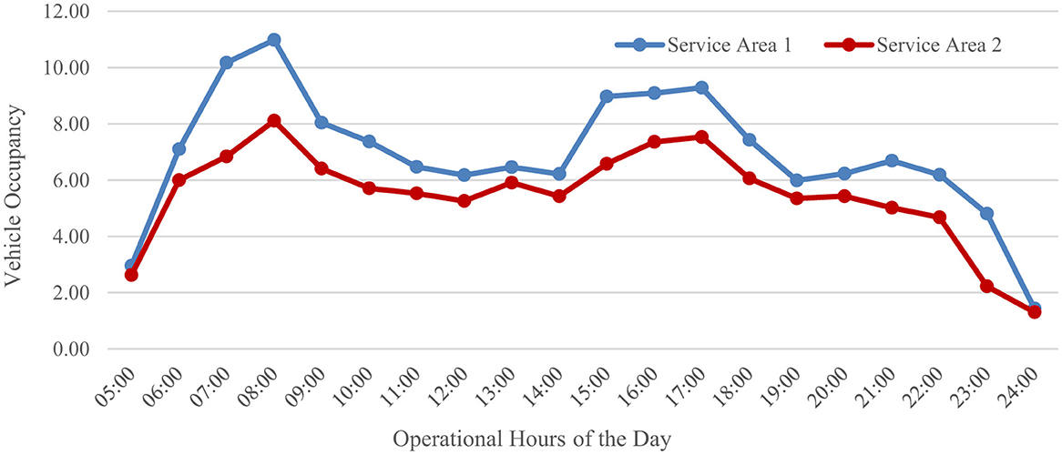 The vehicle occupancy trends reveal a consistent clustering of passengers throughout the day, with average occupancy levels exceeding six passengers per vehicle in Service Area 1 and over 4 in Service Area 2 during most operational hours (see Figure 5). These figures indicate a relatively efficient utilization of vehicle capacity, particularly during peak periods. Despite differences in area size and connectivity to metro stations, both service areas exhibit similar temporal patterns in demand distribution and occupancy levels, with pronounced peaks approximately 8:00 AM and between 5:00 and 6:00 PM. This alignment suggests that user travel behavior in both areas is influenced by common urban activity cycles, such as work and school commutes, highlighting the potential for standardized service planning across different zones.
