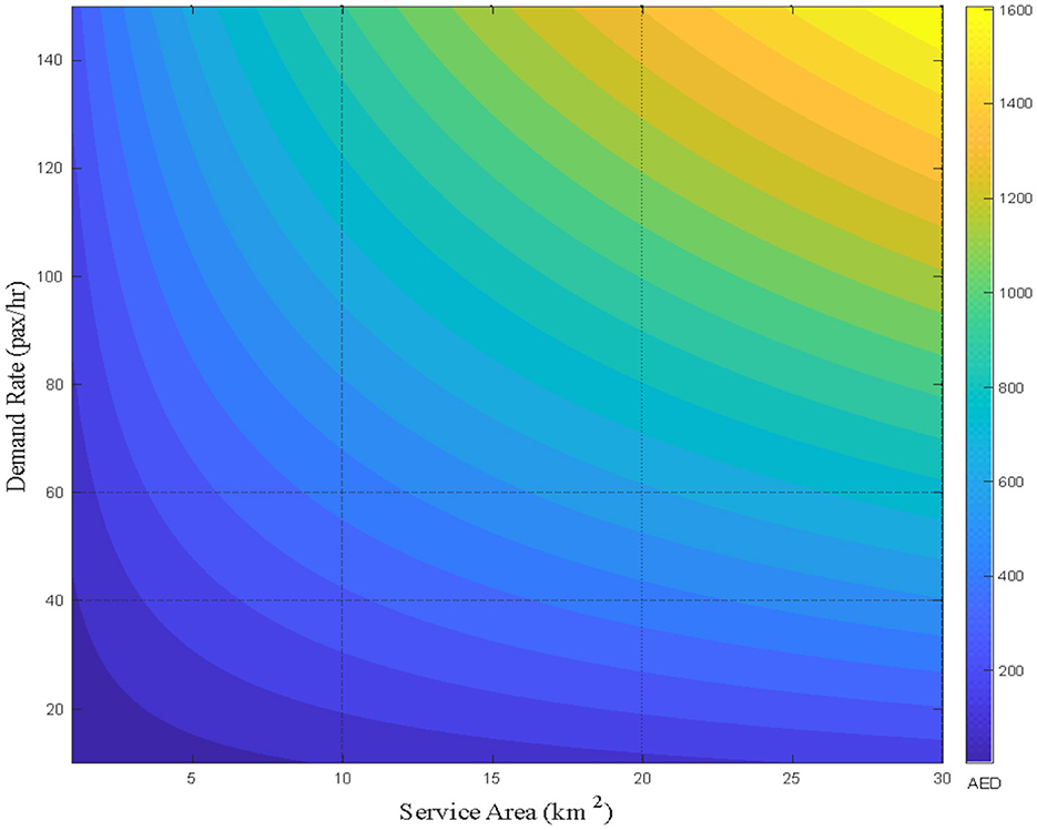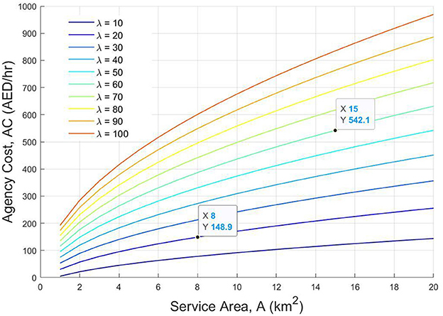 In order to determine how any change in the service area or demand affects the costs, the average cost per trip is computed by dividing the agency cost in Equation 19 by λ, which is plotted in Figure 9, showing all combinations of demand and service areas. As it is desirable to implement changes only if they cause a shift to a lower cost contour (or at least remain on the same contour), the slope of the average cost contour is computed as follows (Rahimi et al., 2018):