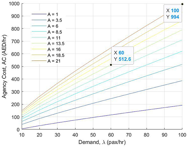 While the agency cost model was developed using the aggregated data from Service Area 1 (area of 15.31 km2), these analytical models can be used for quick estimations of other areas with similar service characteristics. For instance, for a service area of 8 km2, the costs incurred by the agency are estimated to be approximately AED 148/h when the demand density is expected to be approximately 20 pax/veh. From the empirical data available for Service Area 2 (area of 7.87 km2), the agency cost was approximately AED 134/h, which is reasonably close to the estimated costs.