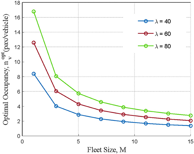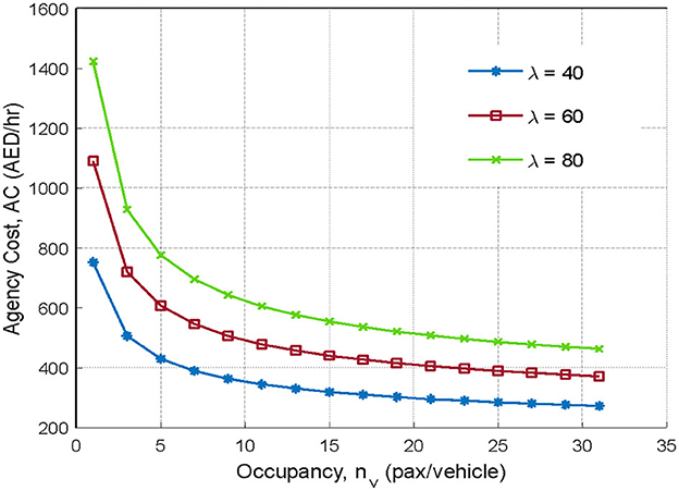 The effect of occupancy on the agency cost at constant demand levels, keeping all other parameters constant, is depicted in Figure 10. For demand levels (λ) of 40, 60, and 80 requests/h, the agency costs drop significantly between the occupancy levels of 10 and 15 pax/vehicle. This indicates that the DBOD, despite being a flexible transportation mode, still retains the “economies of scale” characteristics of the public transit system. When the occupancy levels are below 5, the DBOD can be considered as a typical ride-sharing service, i.e., the taxi service (Huang et al., 2020). As the agency costs become steady above 20, the operating costs cannot be further reduced by deploying larger vehicles with higher capacities.