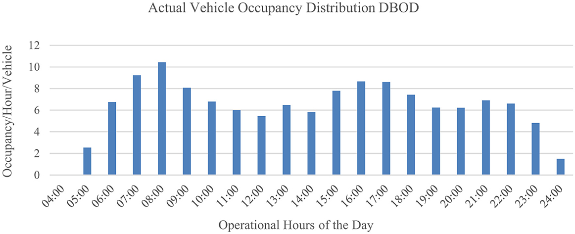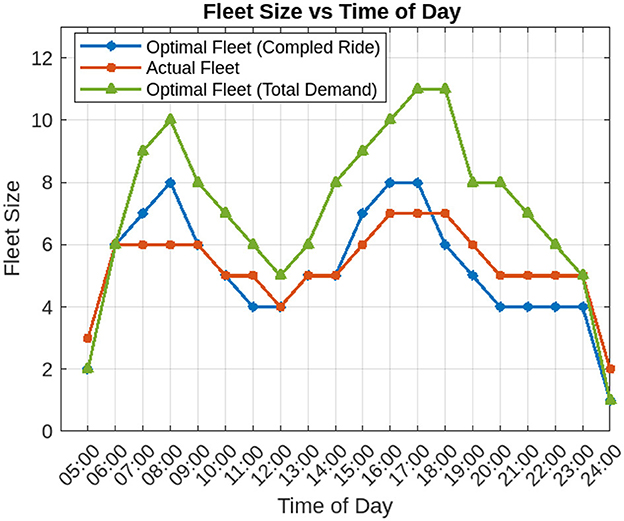 Figure 15 also depicts the optimal fleet size required to meet the total demand at different times of day. However, since the occupancy levels used in the estimation are based on those observed for the actual fleet, the resulting optimal fleet size may be slightly higher than what could be achieved under optimized occupancy conditions.