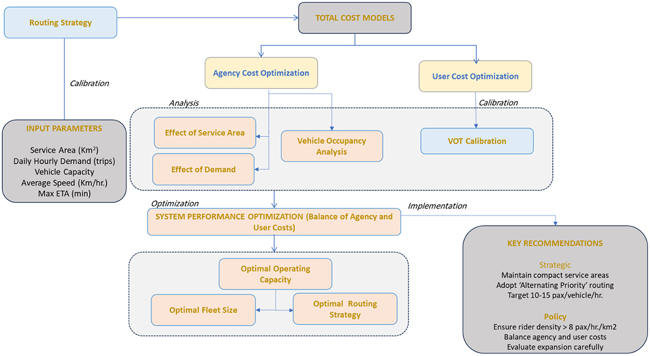 In recent times, many of the DRT deployments have faltered (Currie and Fournier, 2020) and have not been commercially viable. From a practitioner's viewpoint, the main reasons for this are the overestimated budgets created without practical field insights, coupled with the challenges transit agencies face in developing complex simulation-based models (Markov et al., 2021). These models demand extensive data and resources, often proving infeasible for real-world applications. As a result, there is an increasing necessity to develop models and estimates for the performance (Westerlund, 2016) and cost of DRT services (Militão and Tirachini, 2021), with a particular emphasis on identifying practical strategies to enhance system efficiency (Alonso-González et al., 2018; Jang et al., 2025). While some researchers (Amirgholy and Gonzales, 2016; Rahimi et al., 2018) have advocated the use of analytical models due to their simplicity, efficiency, and practicality, others (Rich et al., 2023; Markov et al., 2021) have preferred statistical and machine learning models as they are computationally inexpensive and yield predictions instantaneously. The analytical modeling approach provides valuable data-driven insights and practical recommendations for optimizing transit operations, making them accessible and cost-effective for a wide range of practitioners and policymakers.