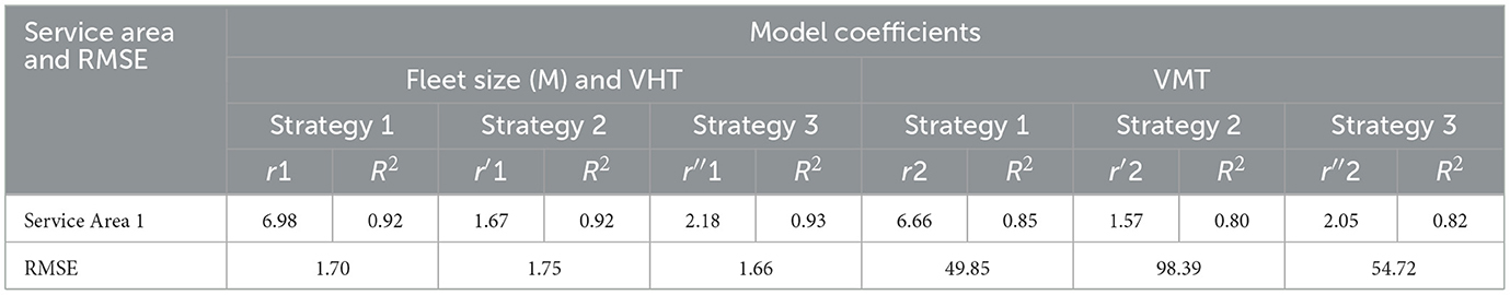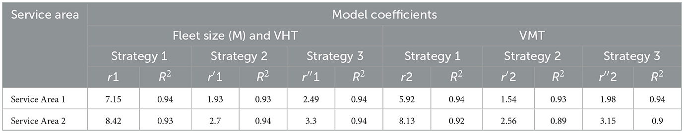 Using the observations from Dubai's BOD, the travel adjustment factors r1 for the fleet and VHT models, and r2for the VMT models are calibrated using ordinary least squares linear regression for all three routing algorithms. The results presented in Table 2, along with the adjusted R2 values, indicate that observed (aggregated) data appear to be a good fit for all routing strategies, with R2 values above 0.9 for both service areas. However, the travel adjustment factors are significantly different, with values higher than 5 for Strategy 1 and hovering closer to 2 for the other two strategies. As this factor is indicative of the efficiency of the DRT service performance and network circuity, it is imperative to identify the actual strategy adopted by the drivers from available data.