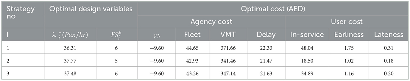 Having calibrated the VOT for DBOD, the total cost model (AC+UC) is adopted to analyze the three different routing strategies described through Equations 5–7. The objective of this exercise is to identify the most effective routing strategy from the perspective of minimizing the total cost. For Service Area 1, the user cost and agency cost models, including the fare, Pi for strategy i, is depicted as follows: