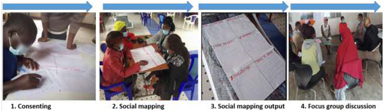 We collected data using focus group discussions (FGDs) and social mapping exercises conducted between August and September 2020. After obtaining informed consent, research assistants facilitated social mapping activities. Social maps were prepared by community members to depict specific social aspects. A social map or chart illustrates the elements that local residents consider significant and pertinent (Chumo et al., 2023d). Social mapping is a valuable social science research method, offering diverse approaches to analyze and visualize social spaces, relationships and processes (Kathirvel et al., 2012). It encompasses various techniques, including participatory mapping and data visualization to reveal complex social dynamics and support collaboration (Kathirvel et al., 2012; Marais and Van Biljon, 2017). These provide tools for promoting dialogue, empowerment, and transformation in communities, making them increasingly relevant for social science research and policy development (Marais and Van Biljon, 2017).