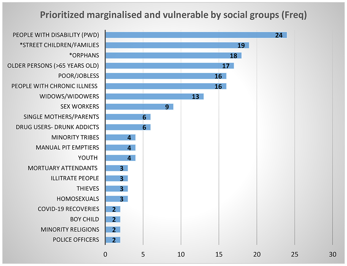 Figure 3. Vulnerable and marginalized groups in priority; *child–headed households: orphans, street children/families. Child-headed households are made up of individuals below the age of 18 who serve as the primary providers for their families. In this study, they were represented by orphans and children from street families.