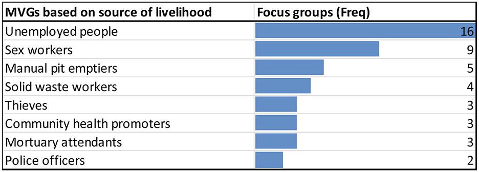 Economic/livelihood vulnerability and marginality are usually incurred by persons who are disadvantaged regarding social goods and services such as income (Gordon, 2020). In our study, the unemployed people faced economic vulnerabilities. Some individuals engaged in hazardous sources of livelihood also faced the vulnerabilities and marginalities associated with their work (Figure 5). The quote below highlights livelihood vulnerabilities experienced by MVGs in the community.