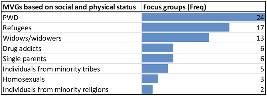 We present study results on who is left behind/who is marginalized and vulnerable, as well as key issues affecting the MVGs from the perspectives of community social groups. The frequencies reported are derived from the dominant frequency identified across all social mapping sessions and further emphasized across the subsequent FGDs.