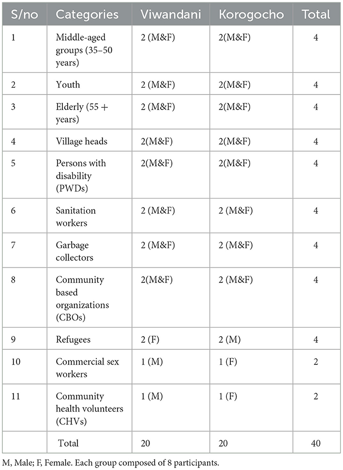 Purposive sampling was employed to select social study groups, prioritizing diversity in demographics and community roles, such as age and gender. Data saturation was achieved at the 40th group, at which point additional group selection ceased. Each group consisted of eight purposively selected participants, representing eight units/villages within each study site. Consequently, the total sample size was equivalent to 320 participants. Purposive sampling was also utilized to select individual study participants, drawing from the NUHDSS sampling frame to ensure a diverse representation of social groups across the eight villages/units in both study sites. The study population encompassed individuals from various life stages, social statuses, occupations, refugee backgrounds, and persons with disabilities (PWD), among other groups (Table 1).