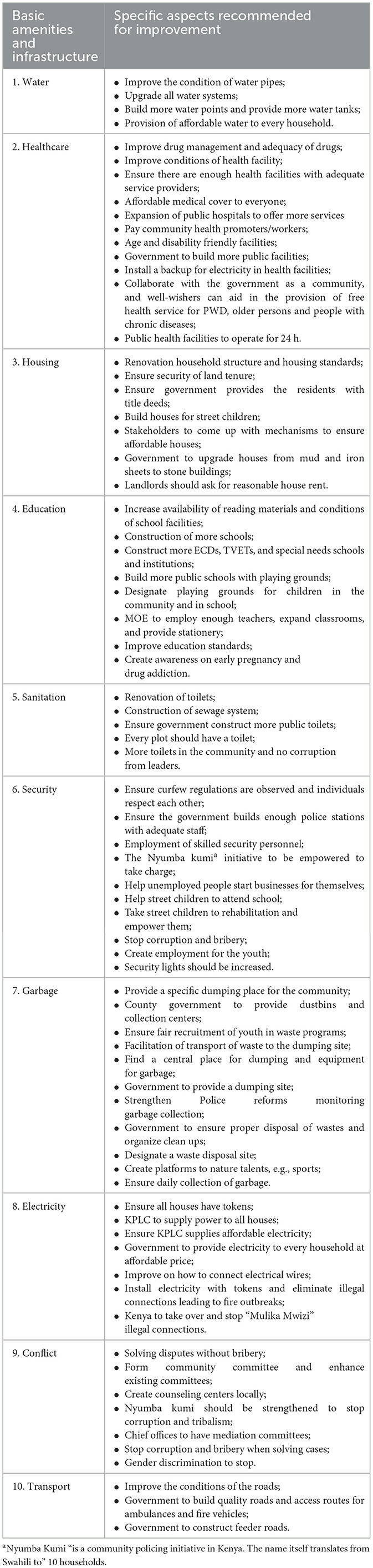 MVGs were described to lack basic amenities like educational and healthcare facilities, or clean water, sanitation and hygiene facilities, and infrastructure like passable roads and floodlights. For example, one informal settlement was illustrated to have only two public primary schools and two public healthcare facilities, constraining residents of MVGs to incur challenges regarding access and quality. The development of physical infrastructures was described as insufficient and the provision of basic services was often taken over by an unregulated private sector, and this affected the accessibility, affordability, and quality of services available. As this was the most important issue affecting the MVGs, we probed for recommendations, as presented in Table A1. Below excepts highlights challenges related to inadequate/lack of basic needs experienced by MVGs in informal settlements.