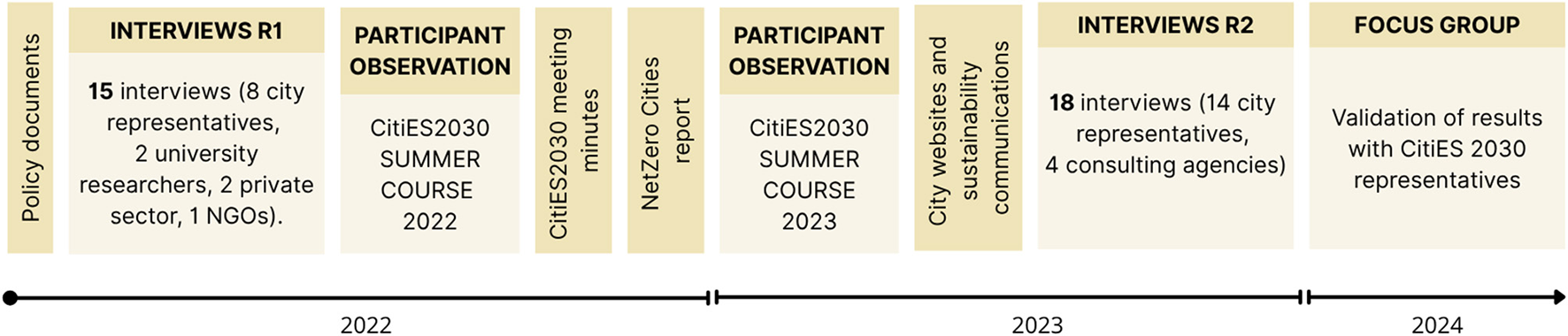 As illustrated in Figure 2 (Author's elaboration), the research combines primary and secondary data sources. Primary data were collected through 28 semi-structured interviews (Table 2) conducted in two waves. The first round (June–October 2022, n = 14) included a diverse array of stakeholders—municipal officials, technical staff, researchers, and NGO representatives—to explore perceptions of capacity needs, barriers, and enabling factors. The second round (September 2023–February 2024, n = 14) focused specifically on city officials and consultancy actors directly involved in drafting Climate City Contracts (CCCs), delving into emerging implementation challenges and adaptive responses. Consultants were included in this phase due to their strategic importance, identified in the first wave. Both interview phases were carried out in parallel with the annual CitiES2030 summer course in Santander—a 1 week immersive workshop promoting peer learning and reflective dialogue on urban transformation. This setting also allowed for participant observation (Corbetta, 2003; Valles, 1997). Additionally, a focus group with four CitiES2030 representatives was convened to validate preliminary findings and foster interpretive co-production.