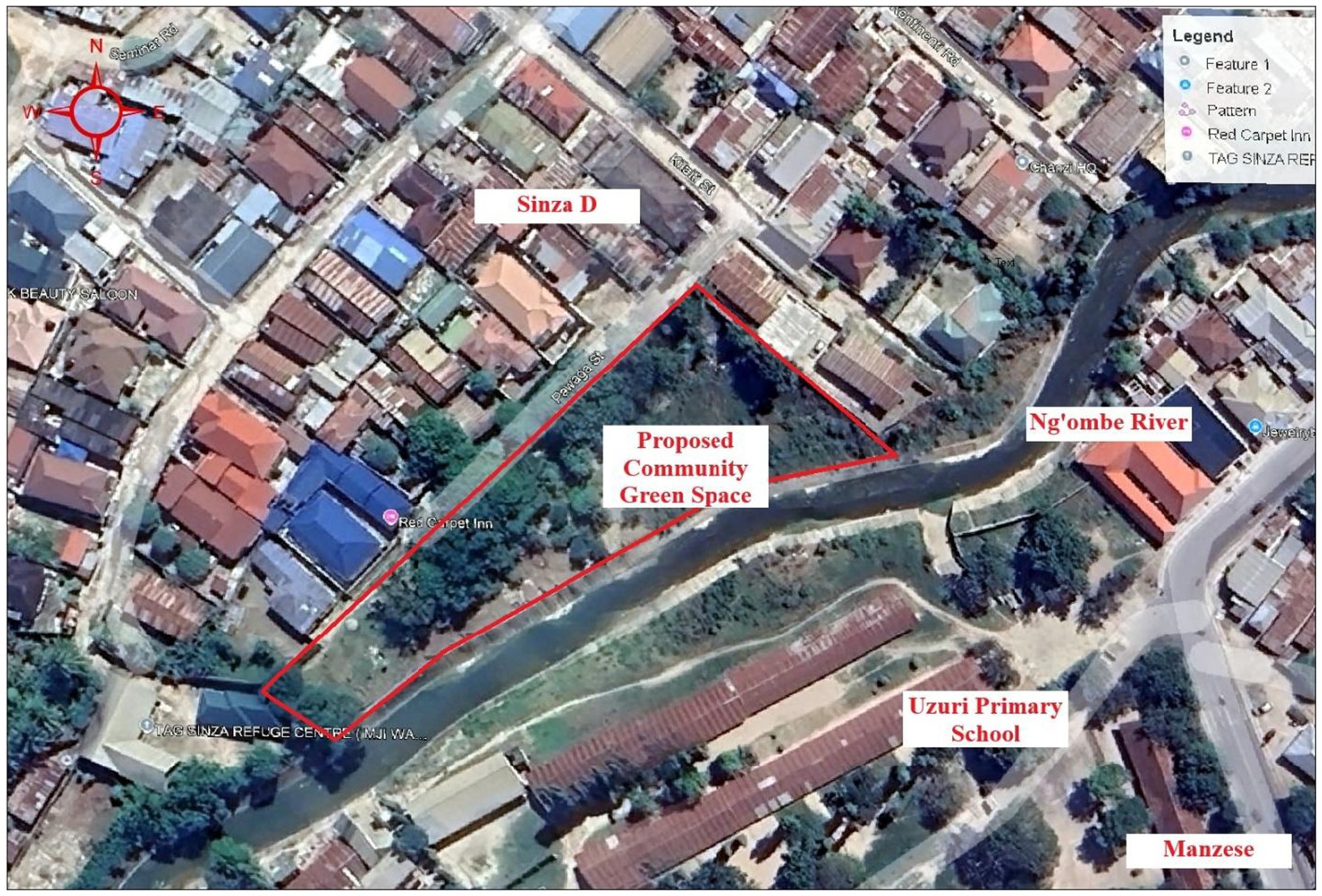 The study focuses on a 0.35-hectare residual open space located along a rehabilitated riverbank bordering Manzese to the south (see Figure 1). Once neglected and flood-prone, the site gained renewed significance following flood-protection works completed in 2020, which stabilised the river channel and created potential for communal use. It now represents one of the few remaining open areas for recreation and collective gathering for residents of both Sinza D and the adjacent neighbourhood of Manzese. Whilst limited in scale, the case is analytically significant as it provides a microcosm through which to examine how university–community collaboration mediates the emergence of grassroots leadership and collective governance in rapidly urbanising contexts. A satellite image (Figure 1) illustrates the site and its surrounding built-up fabric.