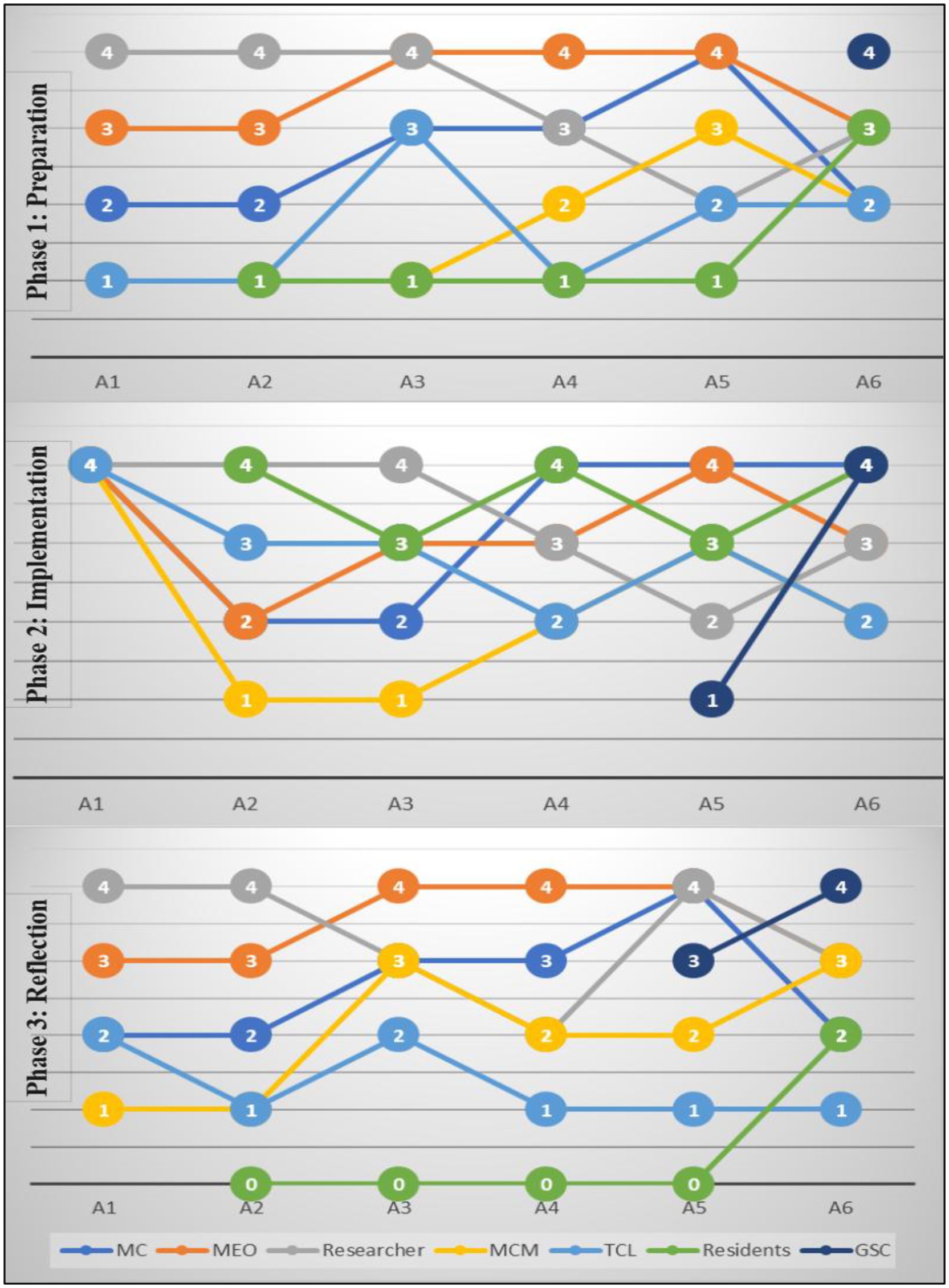 Data analysis relied primarily on thematic coding, complemented by structured observation using a five-point participation scale adapted from the IAP2 Spectrum: 0 = none, 1 = informed, 2 = consulted, 3 = involved, 4 = collaborated. Engagement levels, derived from field notes and reflections, were plotted across six key activities to visualise evolving participation (see Figure 2).