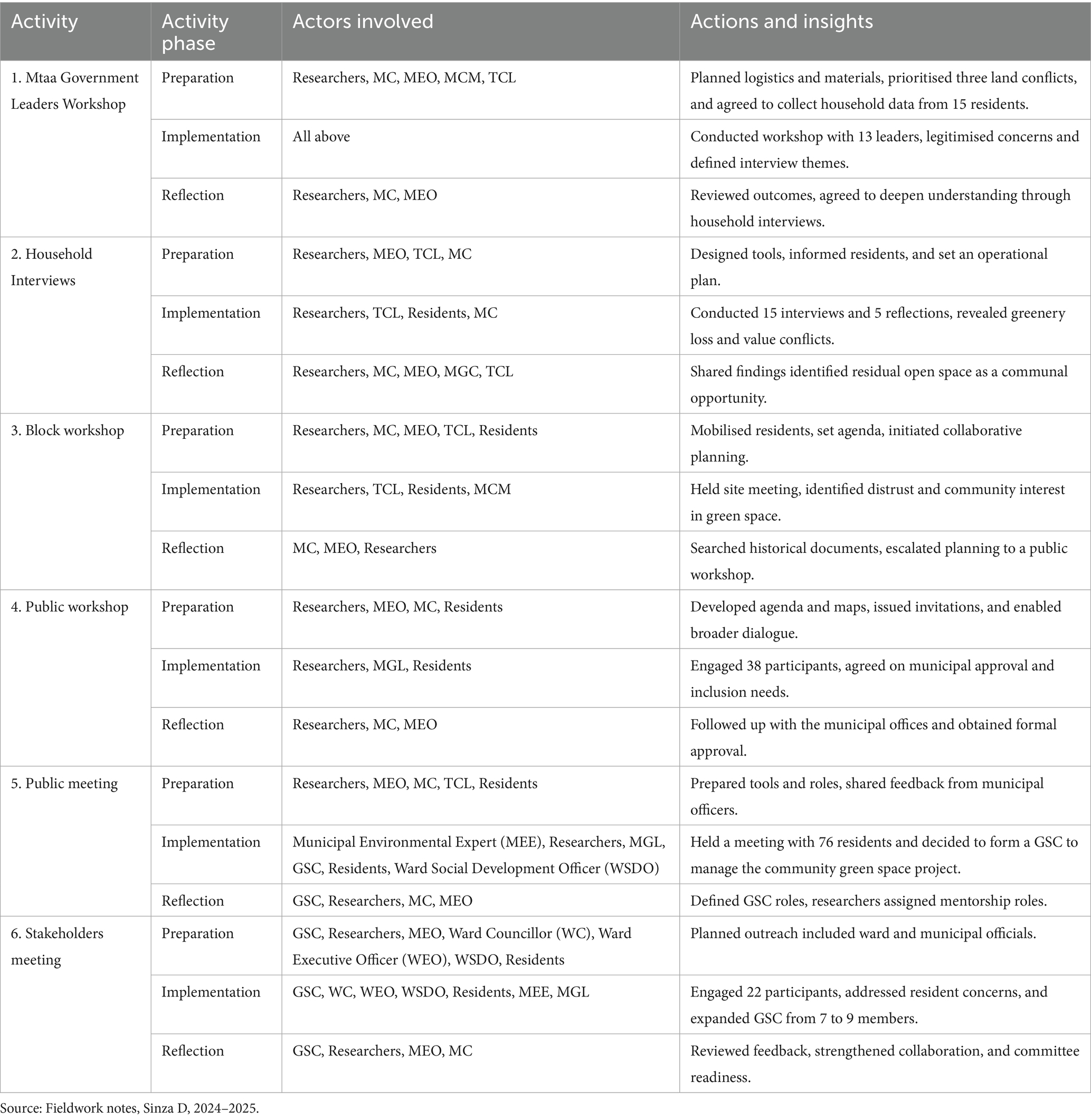 In the final stakeholders meeting, ward and municipal officials recognised the GSC and endorsed its role in managing the green space. The committee expanded from seven to nine members and was formally linked with ward-level environmental programmes. By this stage, coordination and leadership had become embedded within the community’s own structure, with residents assuming full responsibility for decision-making. The GSC’s emergence signalled the consolidation of community leadership, an outcome of sustained facilitation and shared learning between the researchers and extended planners. Table 1 summarises how actors were involved in the collaborative research, the activities that each actor played, how each was involved, and the insights that each group of actors had in Sinza D area.