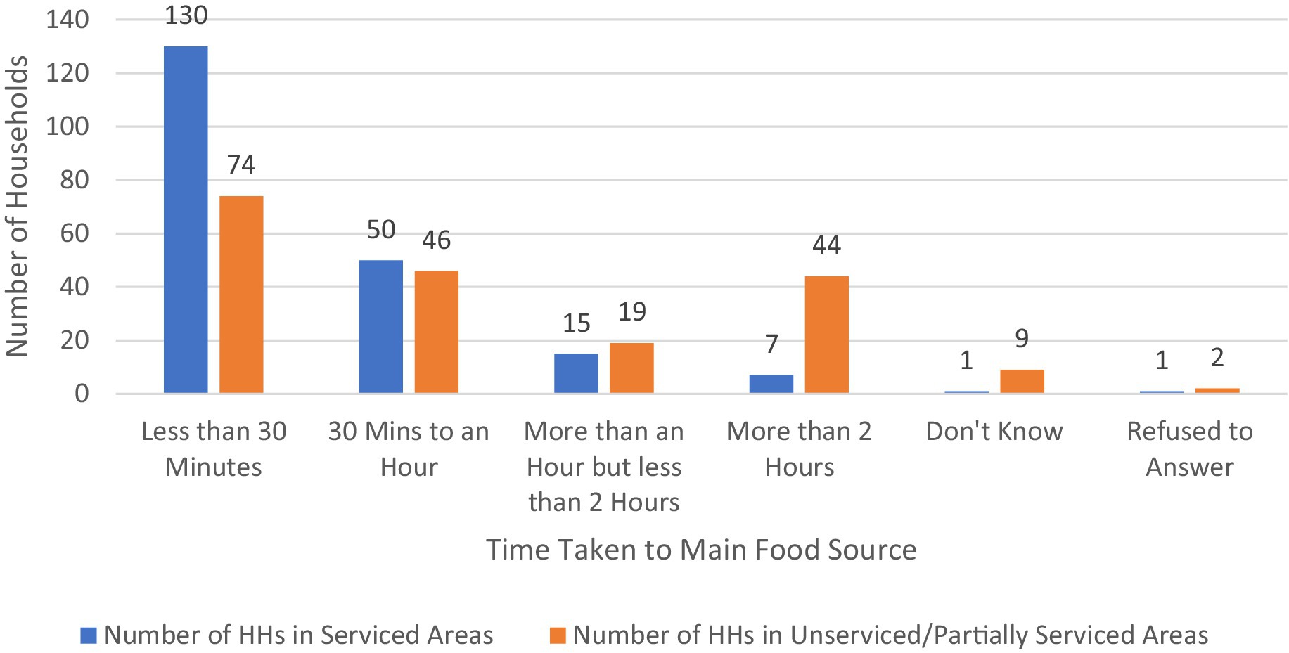 Figure 5. Time taken to travel main food source. N = 398 (Serviced n = 204 and Partially Serviced n = 194).