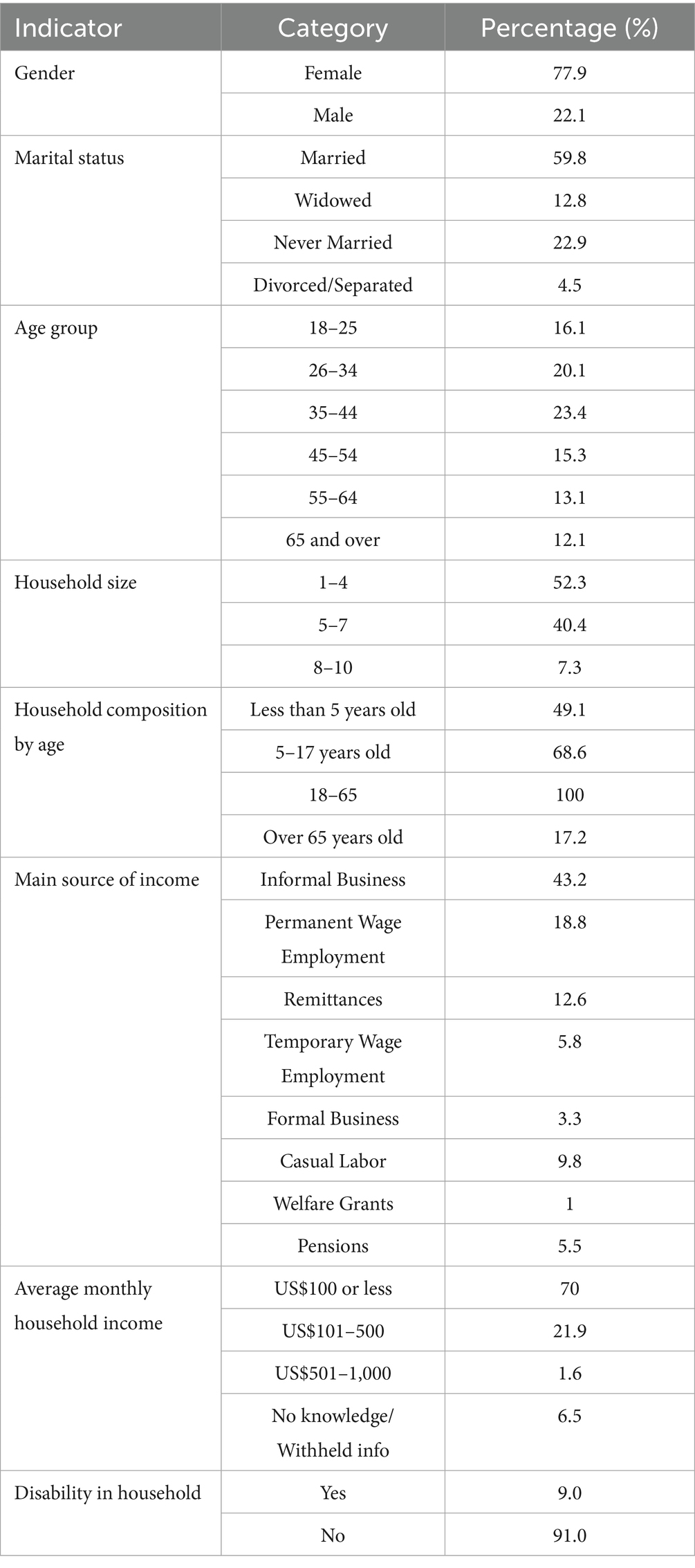 As indicated in the foregoing, 400 households were sampled for the survey and of those, 398 participated, yielding a response rate of 99.5%. This subsection provides a snapshot of the demographic and socio-economic profile of the respondents. Most respondents in the survey (77.9%) were female. This is atypical of Bulawayo as the male household heads are more common than female heads, with a 2017 Inter-Censal survey showing that males lead over 60% of households [Zimbabwe National Statistics Agency (ZimStat), 2017]. However, in this study whereas heads of households were targeted, in some instances proxies were engaged. In addition, fieldwork was conducted during business hours when males, who are traditionally ascribed breadwinners, were often absent, and male household heads present often deferred questions about food to their female partners due to traditional gender roles that associate women with the kitchen. Marital status data in the survey revealed that most respondents were either married (59.8%) or were never married (22.9%). The age distribution was concentrated (88%) among the economically active population (ages 18–64), suggesting potential labor capacity, though employment patterns indicate a prevalence of informality and precarity. The modal household size was 4, with a notable number of dependents under the age of 18, increasing household food needs and caregiving responsibilities.