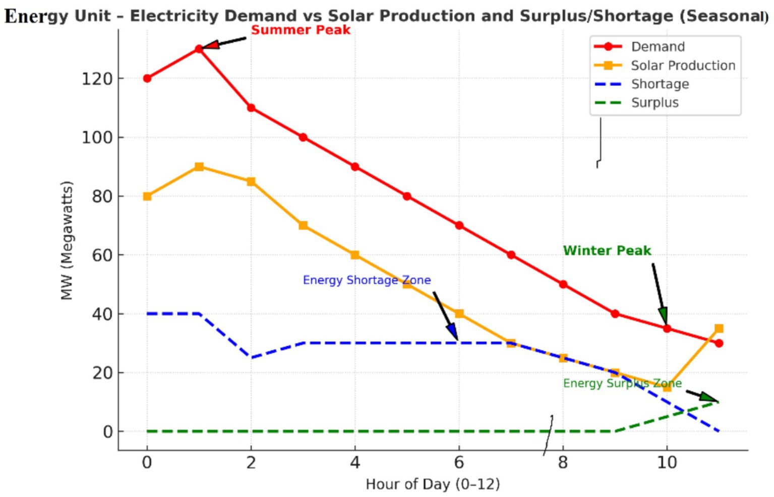 • Energy Unit: Monitors hourly electricity demand versus solar energy production, identifies shortages and surpluses, and estimates potential savings via local solar and storage solutions.