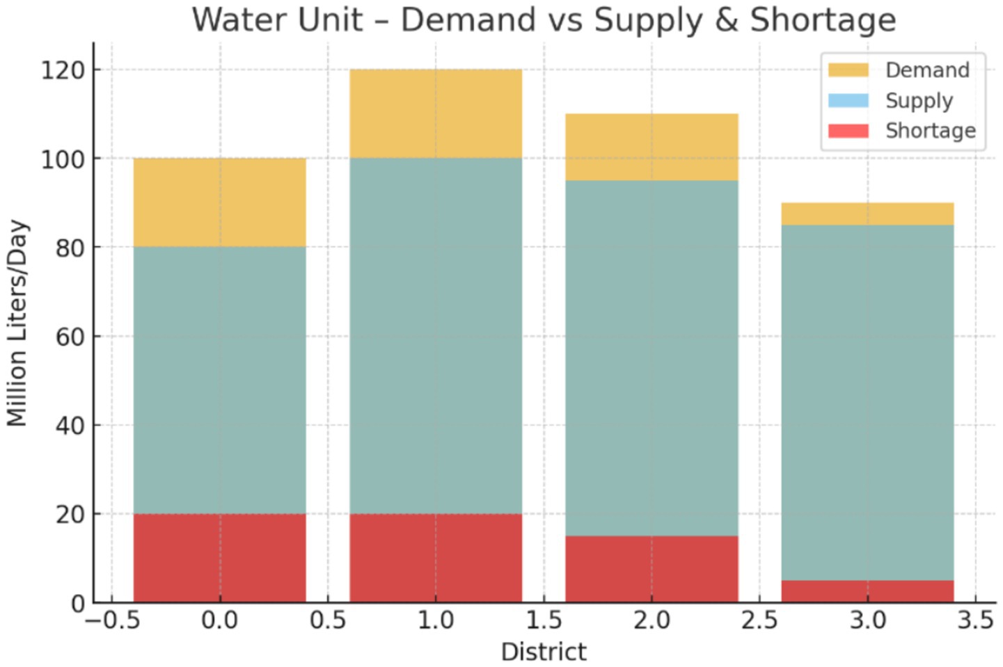 • Water Unit: Tracks district-level water demand and supply, detects deficits, and provides recommendations for optimized water distribution.