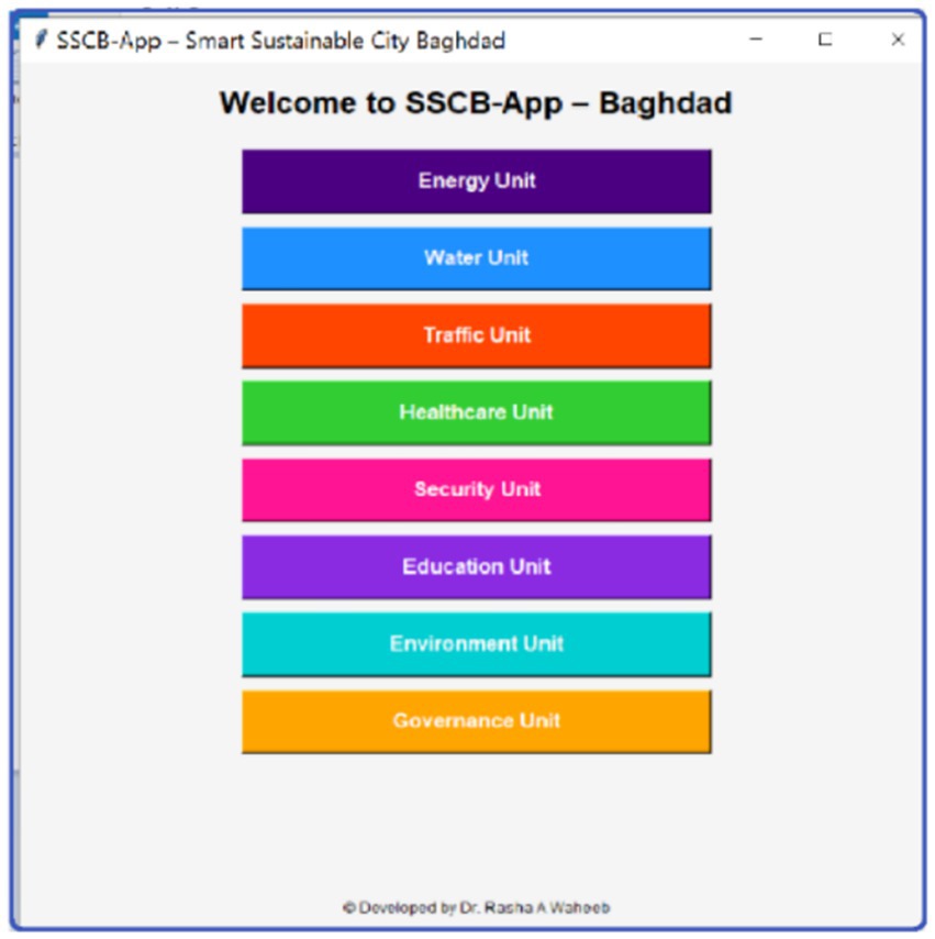 Figure 10. SSCB app smart sustainable city Baghdad. This computational program represents a novel innovation that significantly differs from conventional smart city applications. Unlike fragmented tools that focus on a single sector, the SSCB-App integrates eight interconnected units into a unified, interactive framework. It provides real-time analytics, predictive modeling, and data-driven decision support, enabling city planners to anticipate resource shortages—such as electricity, water, or healthcare staff—and propose proactive solutions. The inclusion of renewable energy modeling, particularly solar power combined with battery storage, adds a distinct sustainability dimension by addressing critical energy deficits. Furthermore, the program is designed to be replicable, scalable, and adaptable to post-conflict or developing cities, offering a holistic, AI-driven approach to urban recovery, resilience, and long-term transformation.