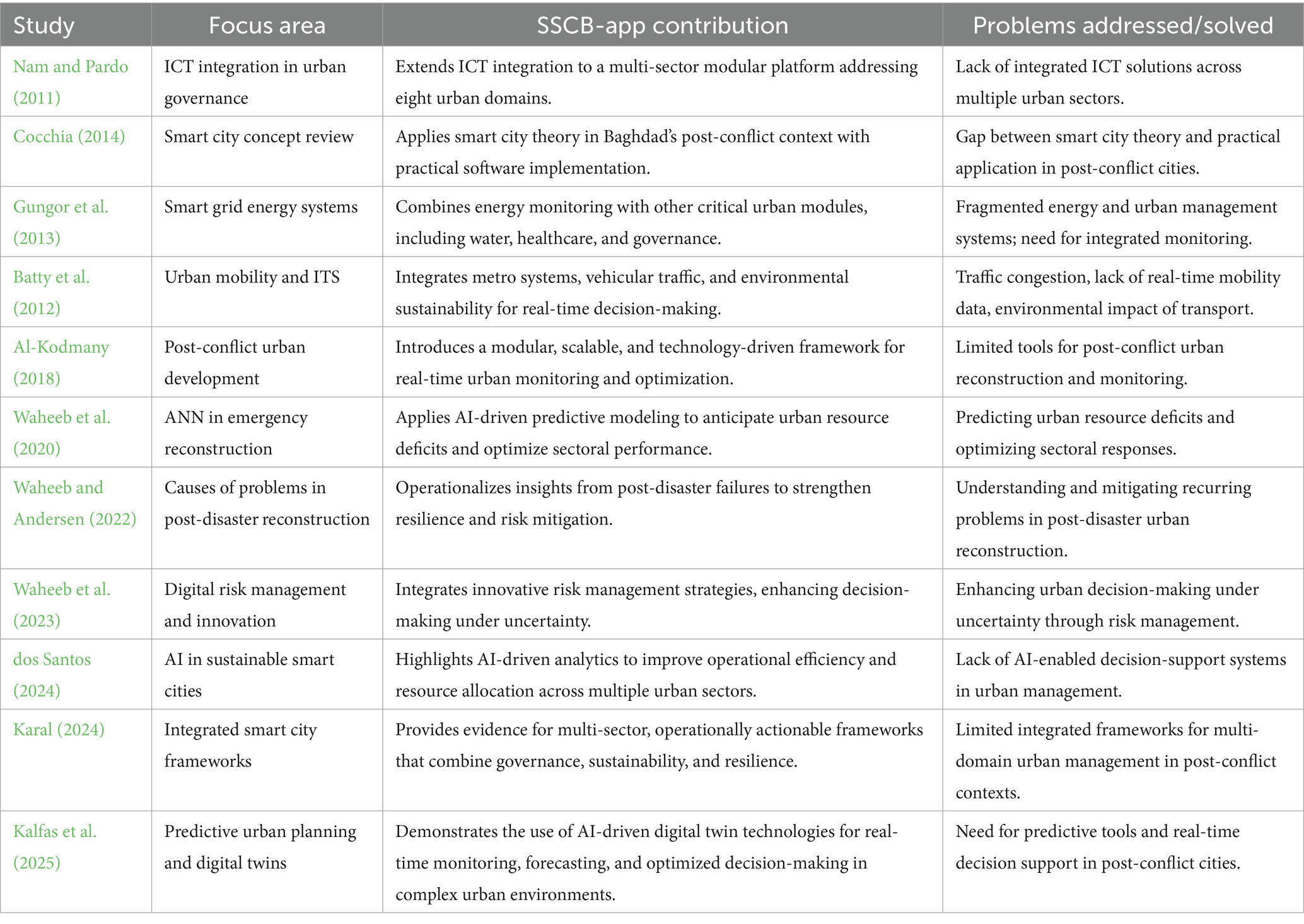 Building upon the studies summarized in Table 1, the current research distinguishes itself through the integration of artificial intelligence across multiple urban sectors. While previous work by Waheeb et al. (2020, 2023) and Waheeb and Andersen (2022) primarily focused on AI applications in specific domains such as emergency reconstruction, post-disaster analysis, and digital risk management, the SSCB-App offers a comprehensive, multi-sector platform encompassing energy, water, traffic, healthcare, security, education, environment, and governance. By leveraging AI-driven analytics, the application enables real-time monitoring, predictive forecasting, and optimized decision-making, ensuring efficient resource allocation and proactive urban management. This holistic integration demonstrates the unique contribution and novelty of the current study, bridging the gap between theoretical frameworks and operational solutions for post-conflict urban contexts like Baghdad.