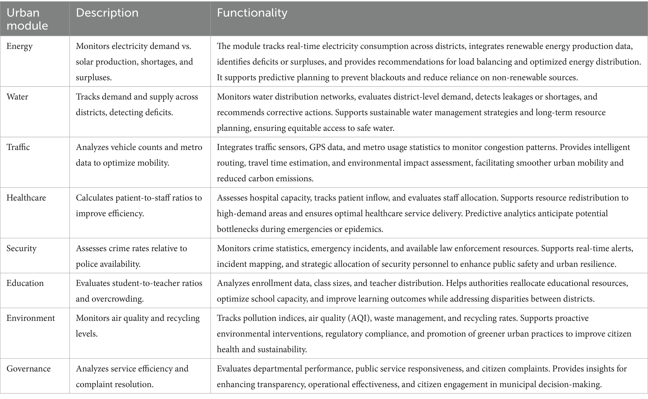 The energy module evaluates electricity demand relative to renewable energy potential, while the water module predicts shortages and recommends optimized allocation strategies. Transport modules analyze traffic patterns to improve routing efficiency, and healthcare modules assess patient-to-staff ratios to strengthen service delivery. Governance modules enhance transparency by tracking departmental performance and incorporating citizen feedback. Education modules monitor student-to-teacher ratios and resource allocation, and environmental modules track air quality, recycling rates, and ecological indicators to support sustainability initiatives. Security modules track crime rates and optimize emergency response deployment.