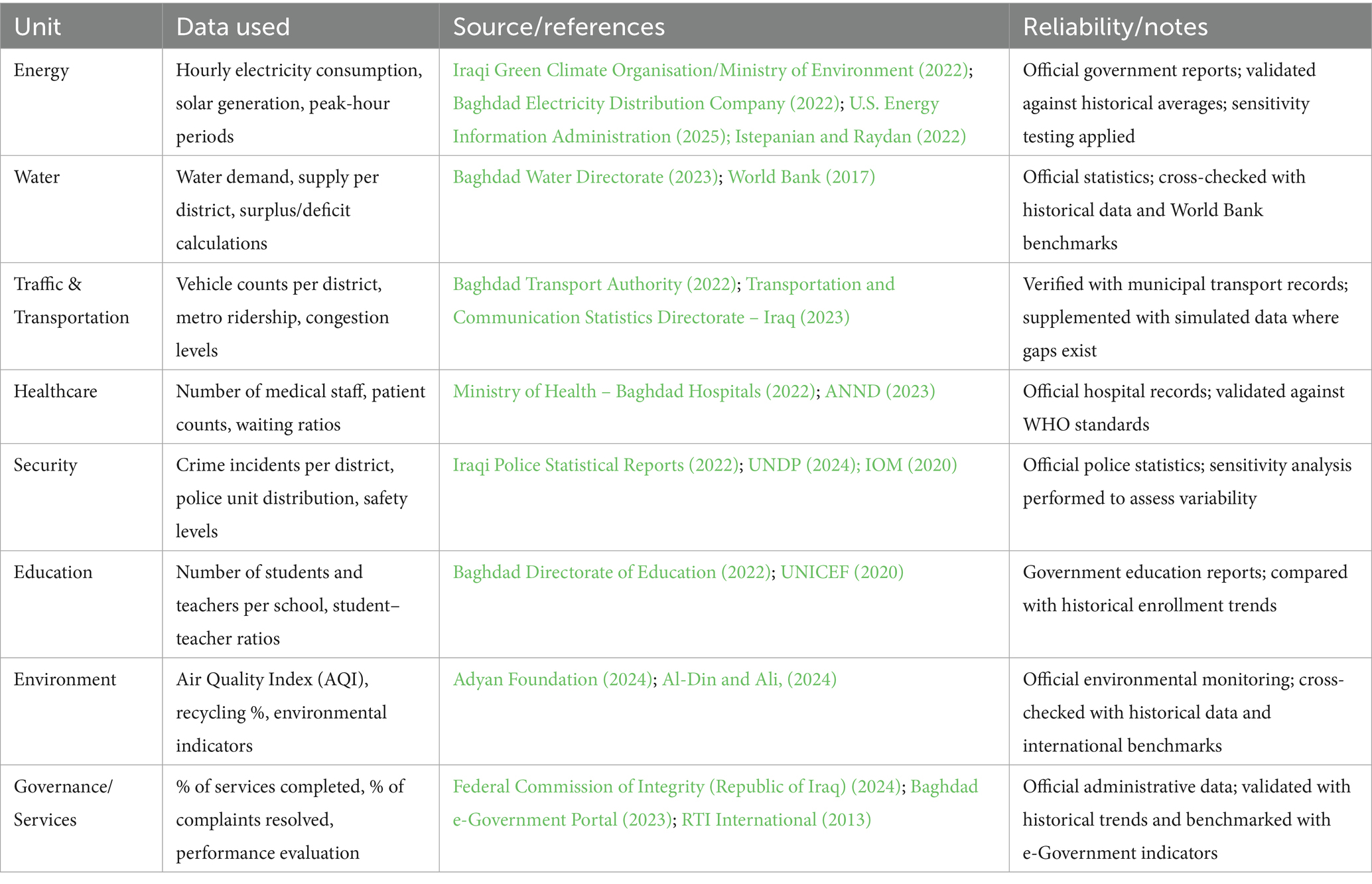 Case Study Description: The SSCB-App case study focuses on two major districts of Baghdad: Al-Karkh and Al-Rusafa, representing diverse urban conditions, population densities, and infrastructure challenges. Data for these districts were collected from official governmental and institutional sources to ensure accuracy and policy relevance. The datasets encompass all SSCB-App modules, including Energy, Water, Traffic, Healthcare, Security, Education, Environment, and Governance. Where real-time or complete data were unavailable, simulated datasets were generated based on historical averages, published research, and internationally recognized benchmarks (e.g., WHO, World Bank, UN-Habitat). Sensitivity validation techniques were applied to test the robustness of the model under varying conditions (Appendix).