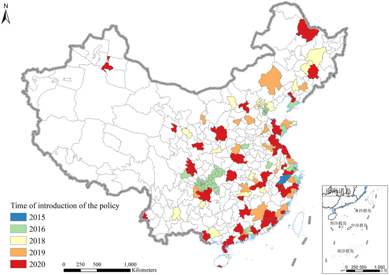 Geographic location and timing of CEPZ establishment in batches. In the legend, 2015 indicates that the city introduced the CEPZ policy in 2015; the same interpretation applies to the other years.