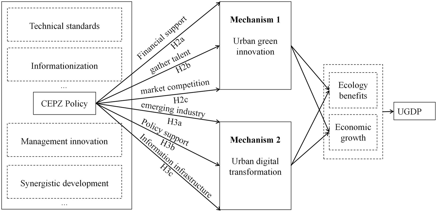 Endogenous Growth Theory suggests that innovation is a crucial driver of economic expansion, with urban green innovation increasingly playing a pivotal role in advancing urban green development (Liao and Li, 2022). Regarding innovation costs, the CEPZ policy offers financial support and tax incentives to foster green innovation. Additionally, CEPZs can centralize funding and talent, thereby lowering financing and R&D expenses and boosting the motivation for technological innovation in pilot cities (Cheng and Jin, 2022). From a market demand perspective, CEPZs eliminate geographical and temporal barriers, and the utilization of artificial intelligence and big data makes it easier to discover new markets (Pillai et al., 2021; Borghi and Mariani, 2021). As market expansion heightens competition, enhancing green technological innovation becomes essential for achieving market recognition and securing investment trust, which in turn improves product competitiveness and social acceptance, thereby strengthening the drive for urban green innovation. Moreover, green technological innovation is inherently knowledge-intensive (Bartlett and Trifilova, 2010). CEPZs, by concentrating funds, talent, and technology, possess a wealth of innovative resources and achieve higher efficiency in green innovation. The spatial clustering of green technological innovation activities fosters knowledge exchange among workers across various innovation stages, lowering the costs of knowledge transformation and further increasing green innovation efficiency. This spatial agglomeration also attracts high-caliber technological R&D talent, helping the urban industrial structures transform and upgrade towards sustainability. The outcomes of green technological innovation in developing countries and regions initially drive urban economic growth, thereby providing the financial backing necessary for enhancing urban green development (Zhou, 2012). Based on this analysis, this study proposes Hypothesis 2: