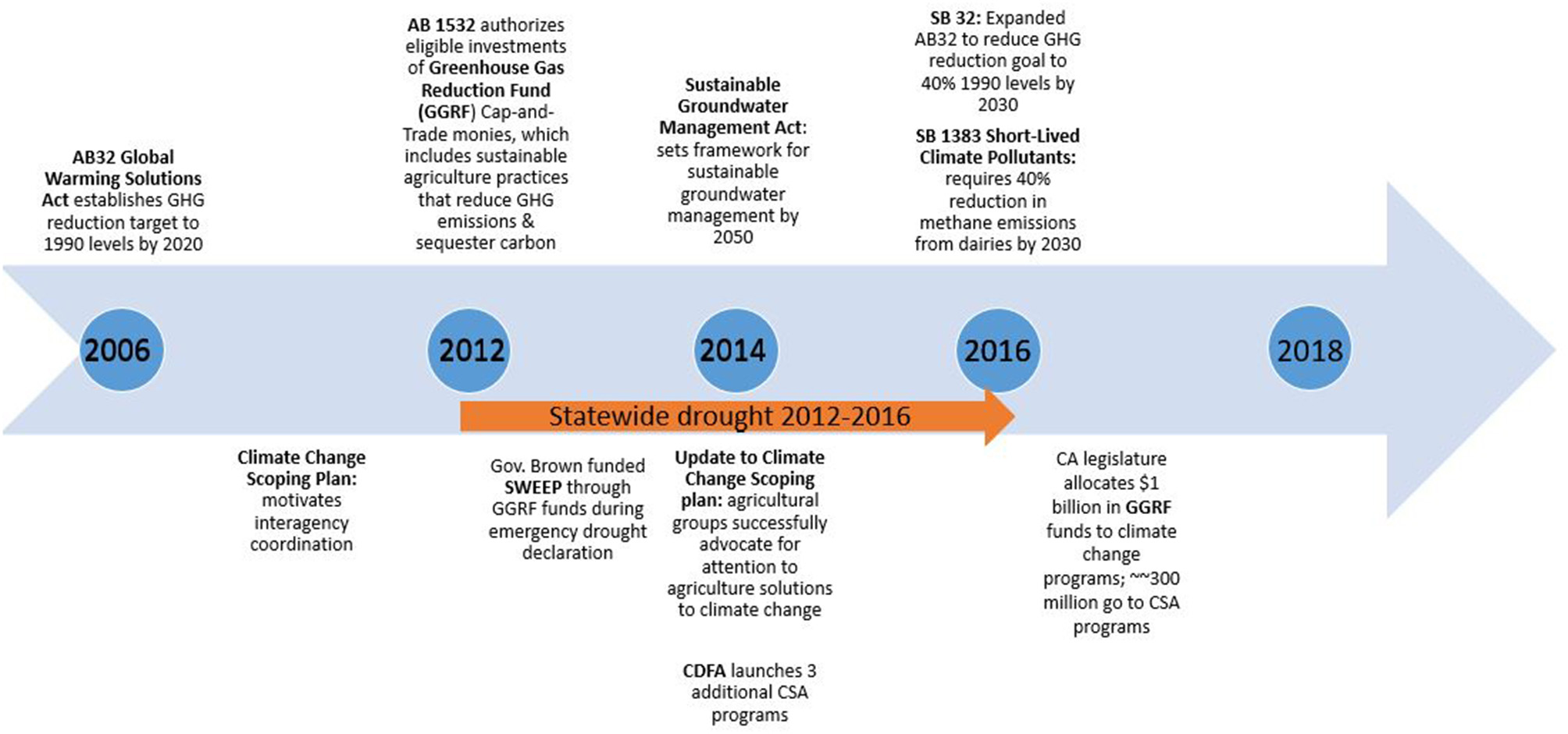 Figure 1. Timeline of evolution of CSA policy environment. This figure provides a brief timeline enumerating key events in the development of multiple CSA policy initiatives in California. While not comprehensive of all initiatives discussed here, this shows how key events overlapped in time with other policy or environmental phenomena.