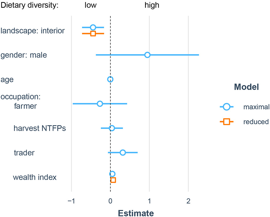 Socioecological predictors of dietary diversity. Results from linear mixed model predicting individual dietary diversity from sociodemographic and landscape differences. Coefficient estimates from full models are shown in blue and coefficients from reduced models retiaing only significant predictors are shown in orange.
