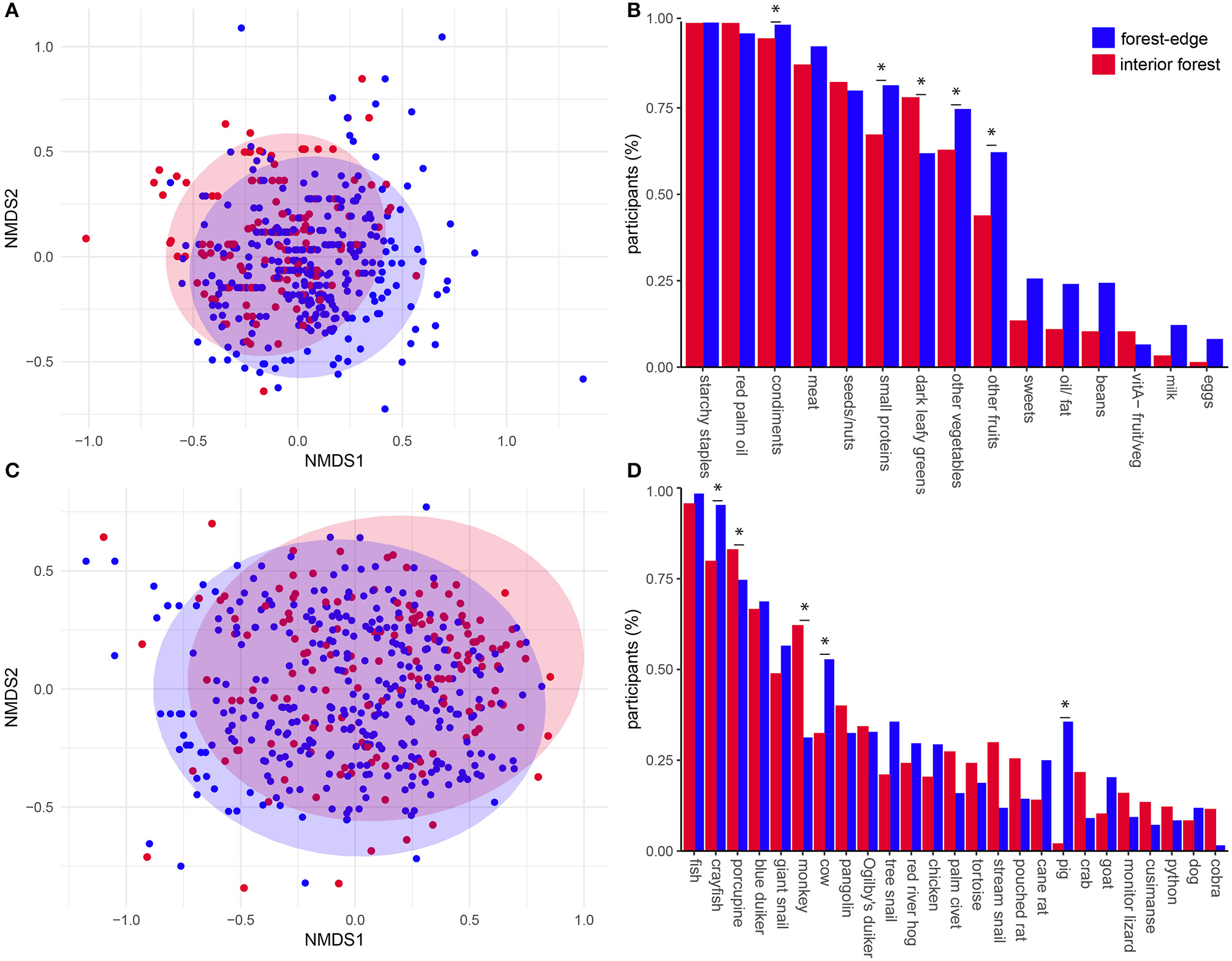 Diet compositions of deep and forest-edge communities. Nonmetric multidimensional scaling (NMDS) plot of the first two axes of Jaccard distance matrices describing dietary composition from 24-h recall data (stress = 0.11, k = 4) (A) and bushmeat composition from 30-day recall data (stress = 0.16, k = 3) (C). Plots are comparing dietary compositions of individuals in interior (red) and forest-edge (blue) forest communities. Barplots compare relative frequency of consumption of food items from each food category (B) and different animals (D) between locations (items with relative frequency < 0.05 not shown). Asterisks indicate indicator foods with IV > 0.3 and p < 0.05 of deep and forest-edge diets.