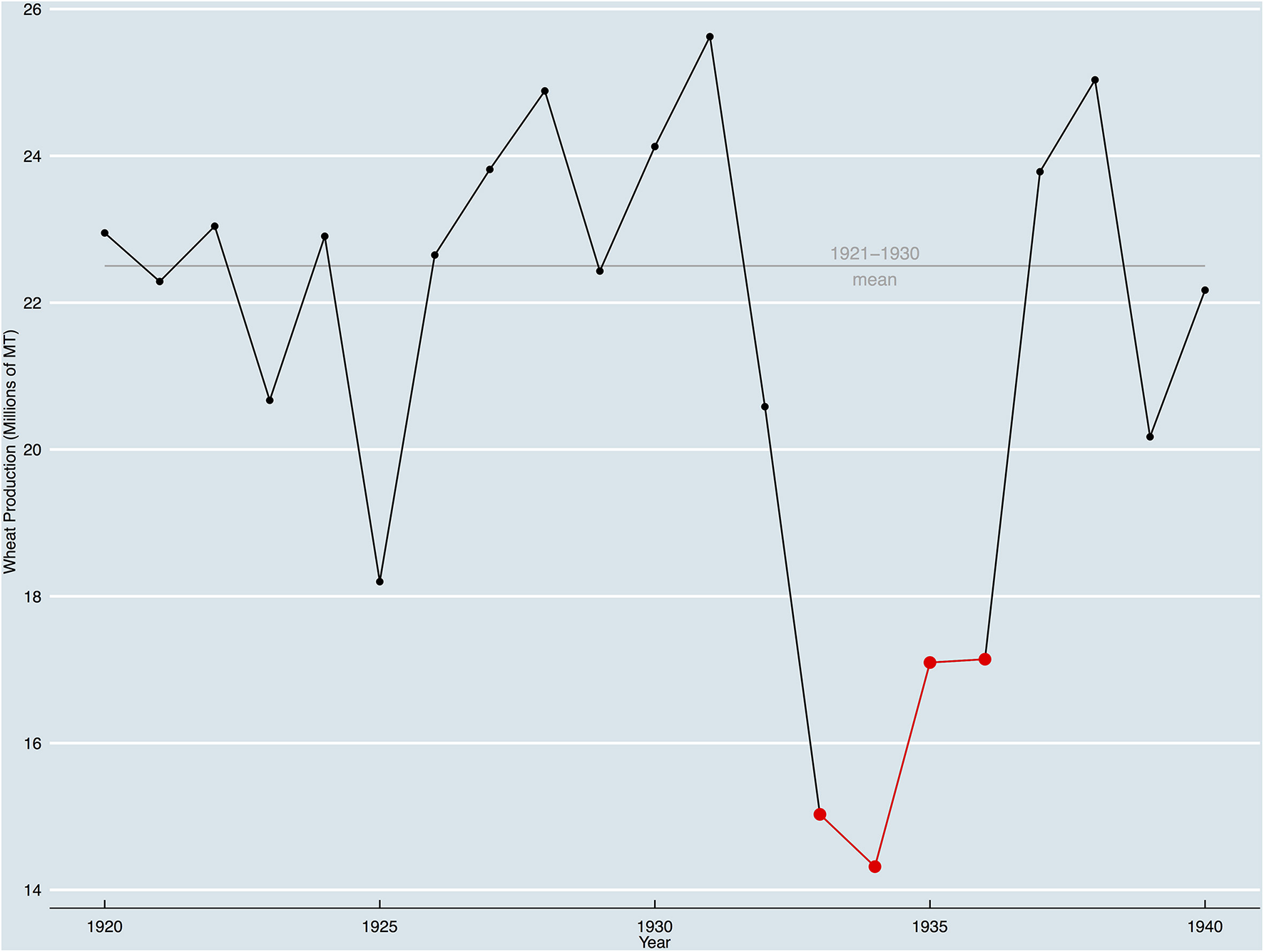Figure 2. US wheat production from 1920 to 1940 in metric tons based on data from the USDA National Agricultural Statistics Service (USDA, 2019b).
