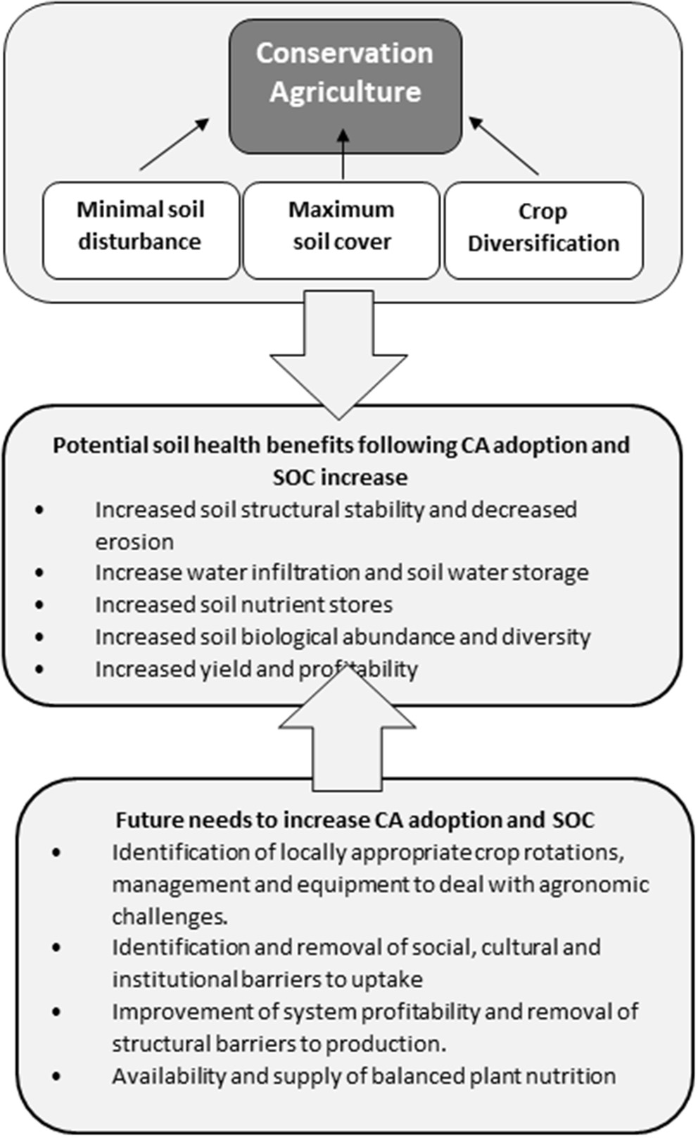 Figure 1. Summary of the benefits of increased soil organic carbon (SOC) under conservation agriculture (CA) and the future needs to increase adoption.