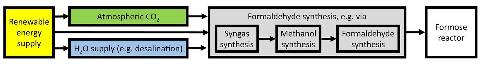 The optimum synthesis path from CO2 and H2O to, e.g., glucose is subject to future research. For this first feasibility study, we exemplify the concept by highlighting that Deng et al. (2013) demonstrated for the formose reaction scheme