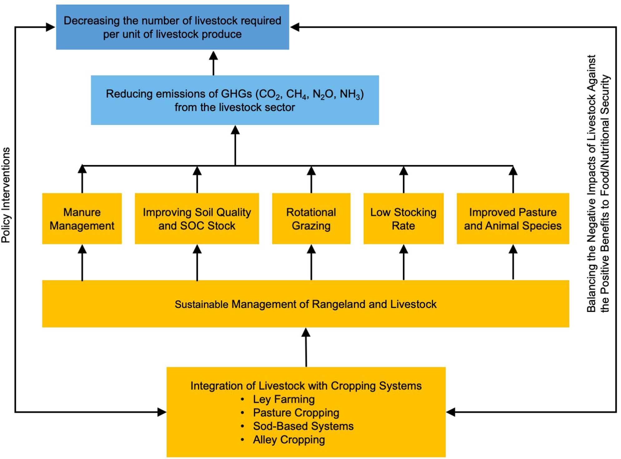 Per capita intake of animal protein is expected to increase globally through 2050, and the rate of increase will be more in developing or emerging economies than in developed countries. Global meat consumption between 1980 and 2050 is projected to increase from 133 million to 452 million tons, and 86% (279 million tons) of the increase will occur in developing countries. Animal-based agricultural systems occupy 45% of the global land area and contribute a large proportion of agricultural emissions. In addition to being a major source of nitrous oxide (N2O), methane (CH4), and other greenhouse gases (GHGs), livestock also use 8% of the global water withdrawal. The animal sector is dominated by resource-poor and small landholders of developing countries. Adverse effects of livestock on the environment are caused by the way animal husbandry is practiced, in no small part because animals are not integrated with other agricultural and forestry-based practices. Thus, improving and sustaining the livestock sector is critical to advancing the Sustainable Development Goals (SDGs) of the United Nations, especially SDG #1 (No Poverty), SDG #2 (Zero Hunger), SDG #6 (Clean Water and Sanitation), and SDG #13 (Climate Action). Separating raising of livestock from cultivating seasonal crops and perennial trees has decoupled the biogeochemical/biogeophysical cycling of carbon (C), water (H2O), nitrogen (N), phosphorus (P), and sulfur (S). This decoupling is a causative factor of the increase in emissions of N2O and CH4, eutrophication and contamination of water resources, degradation of rangelands, and decline in its biodiversity. Therefore, identifying and adopting systems that integrate livestock with crops and trees are critical for reducing the environmental footprint of animal-based dietary products. Incorporating pastures/forages in the rotation cycle along with controlled grazing, called ley farming, and agroforestry, such as alley cropping, are examples of integrated farming systems. Other strategies of reducing the environmental footprint comprise the following: reducing enteric fermentation by precision feeding and matching dietary protein to animal need, processing CH4 and N2O emissions for other uses, and managing manure and other animal waste prudently. Other important considerations are adopting multiple GHG perspectives and minimizing gas swapping, reducing wastage of animal products, decreasing the use of antibiotics, and restoring rangeland for sequestration of atmospheric CO2 as soil organic matter.