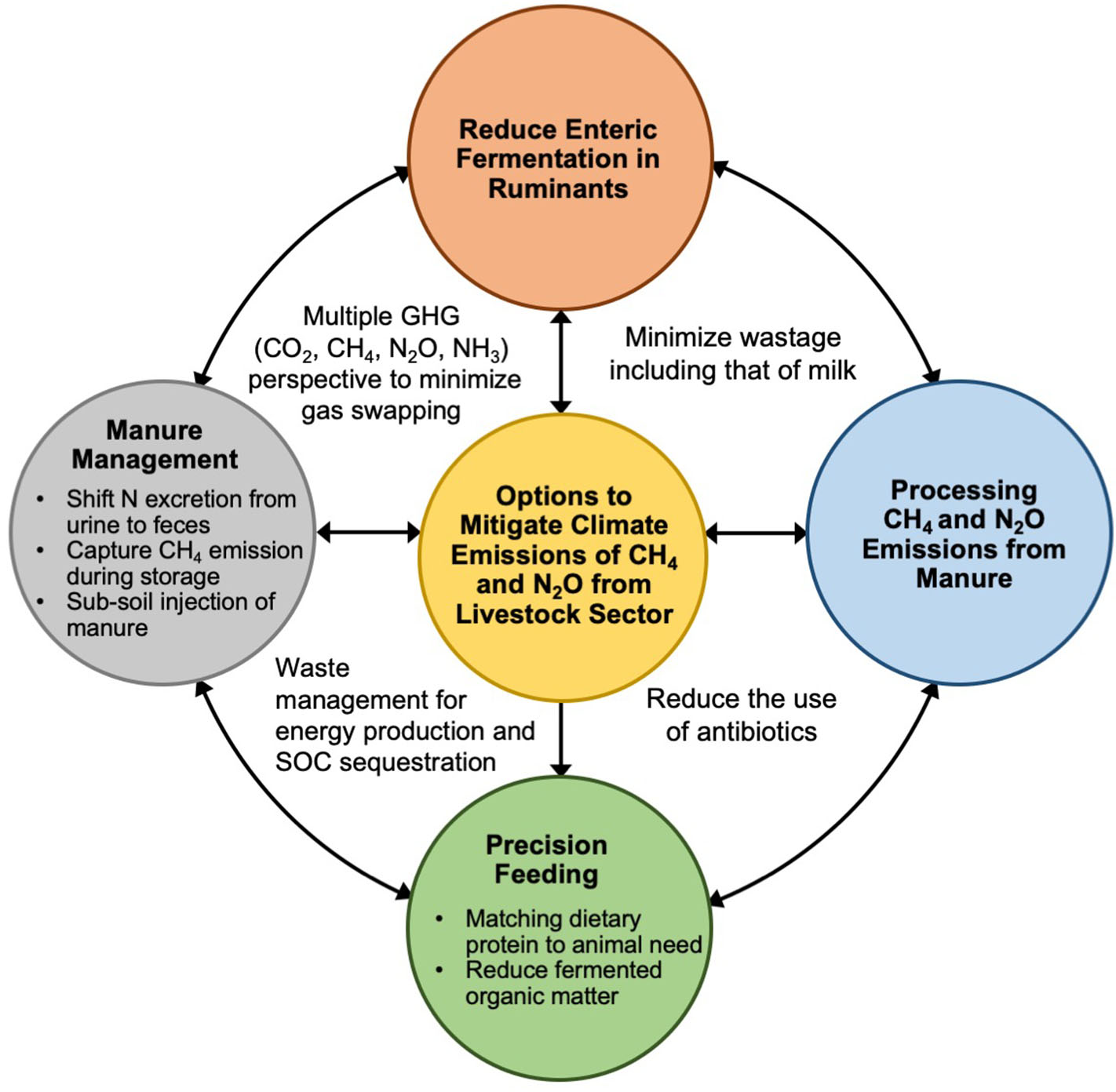 In addition to water, reducing emissions of GHGs from the livestock sector is pertinent to advancing SDG #13 (Climate Action). Because of its importance, the interaction between climate change and the livestock sector is now widely recognized (Thornton et al., 2009). Livestock are responsible for a large part of agricultural emissions (Gill et al., 2010; Havlík et al., 2014). Agriculture contributes about 10–12% of the current anthropogenic emissions. Some estimate that direct livestock non-carbon dioxide emissions caused about 19% of the total modeled warming of 0.81OC from all anthropogenic emissions in 2010 (Reisinger and Clark, 2018). GHG emission per unit of livestock product is more in ruminants than that in monogastric animals (Gill et al., 2010). Because of the high global warming potential (GWP) of CH4 and N2O, it is appropriate to combine the cumulative effect of all GHGs into CO2-equivalent (Pitesky et al., 2009).