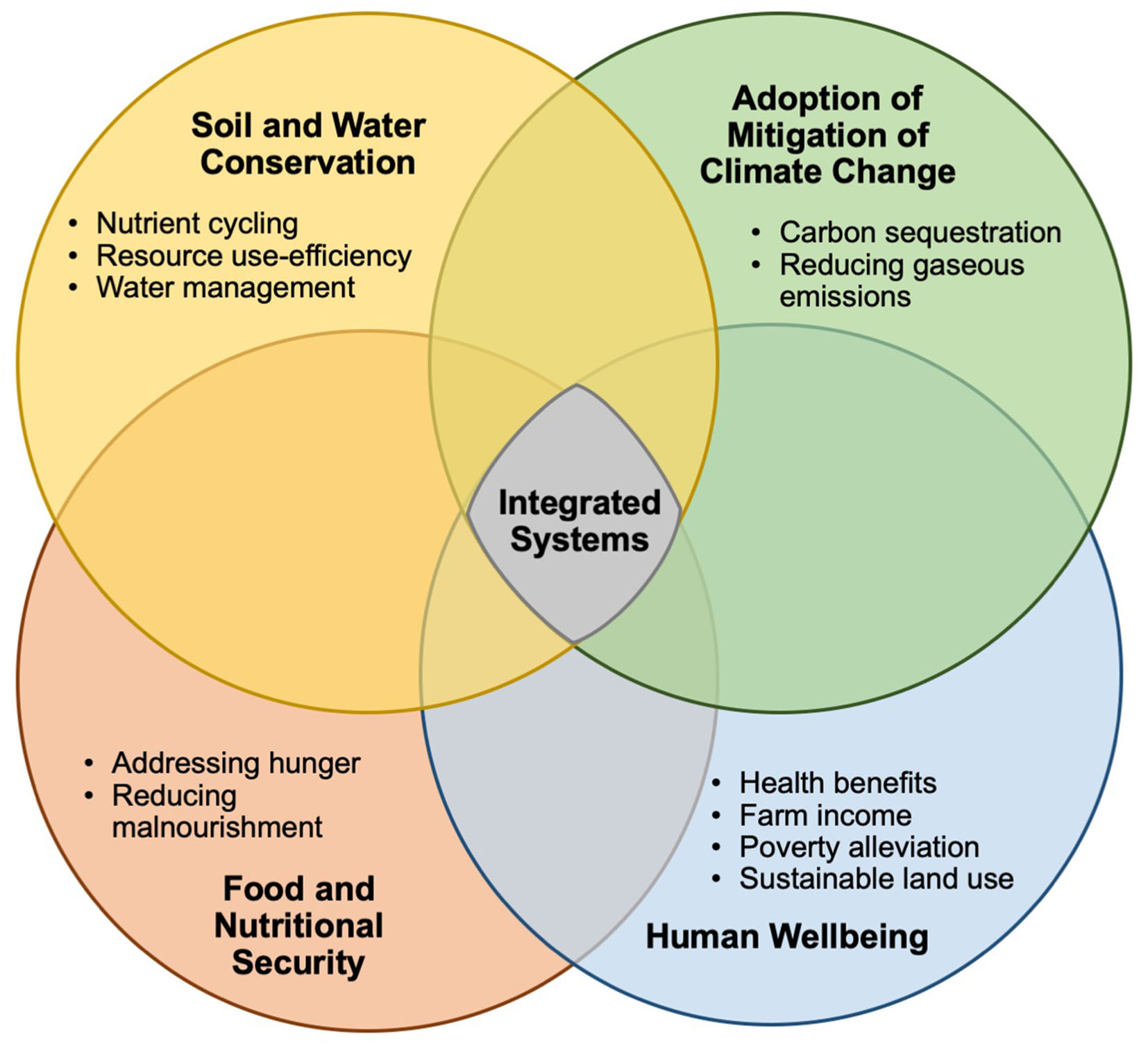 Ecological and socio-economic benefits of integrating livestock with crops and trees.