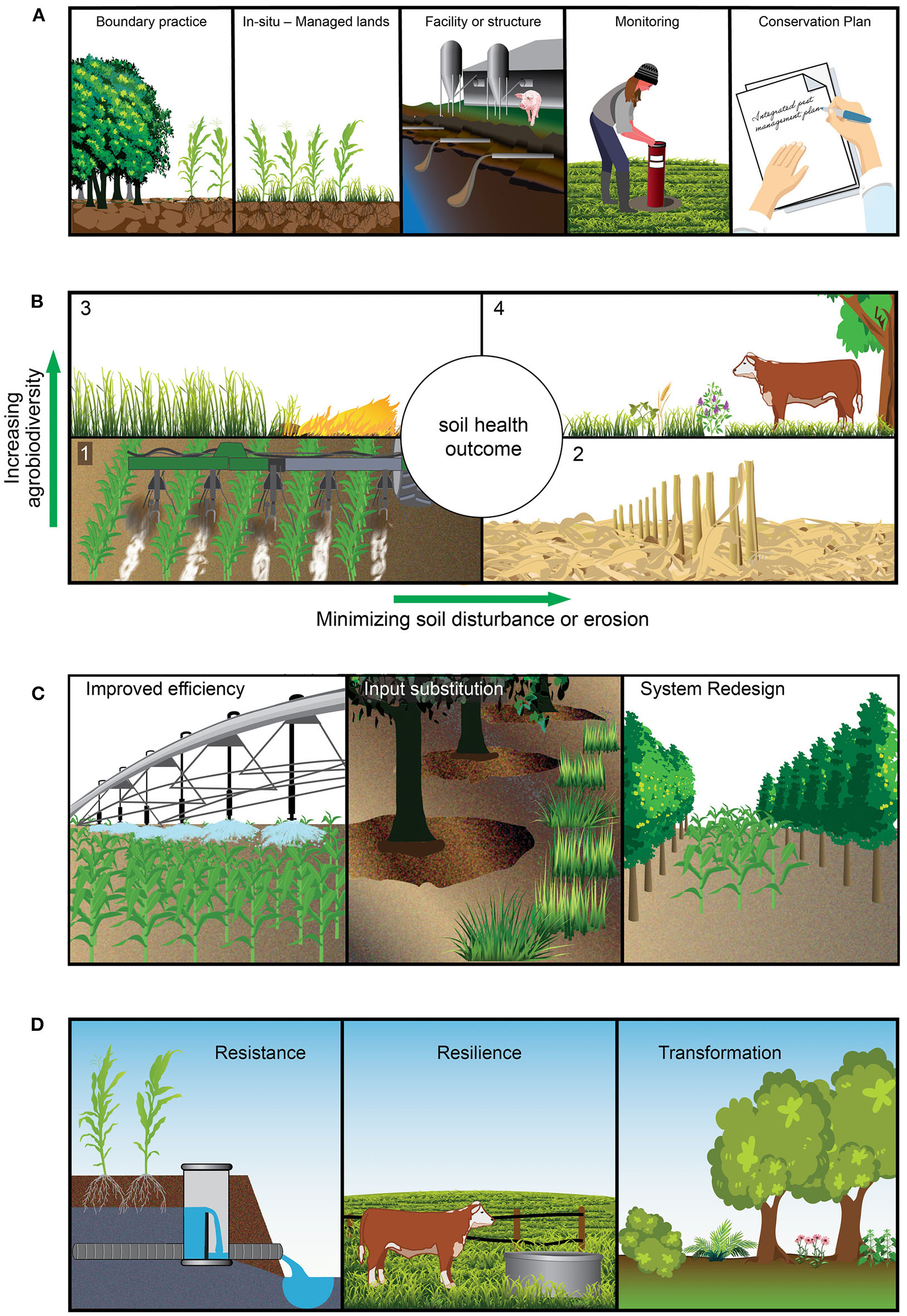 Representations of practices and the various categories included in this analysis. USDA NRCS National Conservation Practice Standards code numbers are included below in parenthesis and can be found at the Standards Catalog Website (USDA-NRCS, 2020b). (A) illustrates the categories within the “type” classification, including: boundary practices, represented by Windbreak/Shelterbelt Establishment (380); managed lands, represented by Cover Crop (340); facility or structure, represented by Waste Storage Facility (313); monitoring, represented by Groundwater Testing (355); and conservation plan, represented by IPM Herbicide Resistance Weed Conservation Plan - Written (154). (B) illustrates the categories within the “soil health outcome” classification, including: Quadrant 1, no change or improvement to soil health, represented by Nutrient Management (590); Quadrant 2, reducing soil disturbance or erosion, represented by Residue and Tillage Management, No-Till (329); Quadrant 3, increasing agrobiodiversity, represented by Prescribed Burning (338); and Quadrant 4, both reducing soil disturbance or erosion and increasing agrobiodiversity, represented by Silvopasture (381). (C) illustrates the categories within the transition to ecologically-based management classification, including: Level 1, increasing efficiency, represented by Irrigation Water Management (449); Level 2, input substitution, represented by Mulching (484); and Level 3, system redesign, represented by Alley Cropping (311). (D) illustrates the categories within the adaptive strategy classification, including: Resistance strategies, represented by Drainage Water Management (554); Resilience strategies, represented by Prescribed Grazing (528); and Transformation strategies, represented by Multi-story Cropping (379).