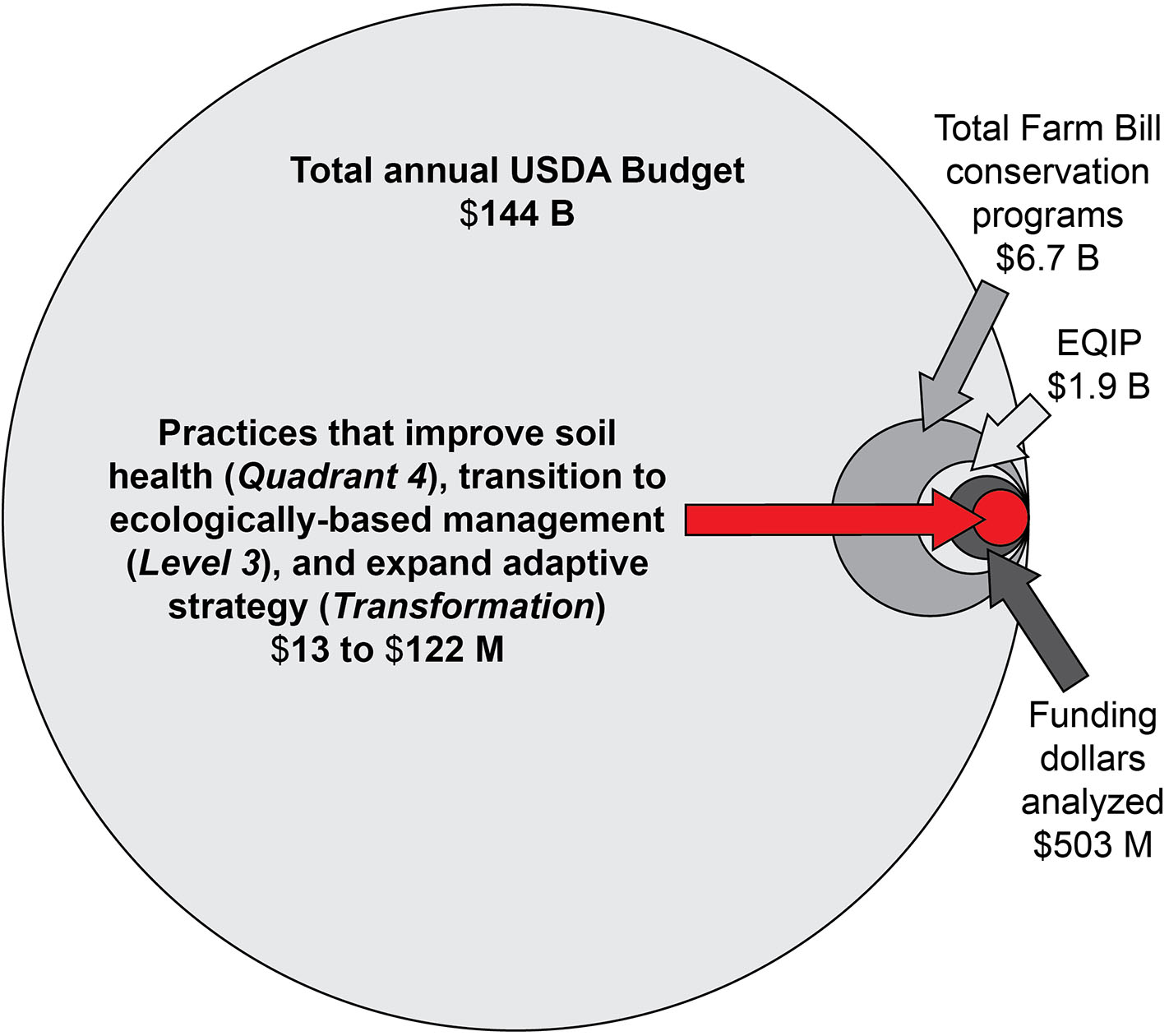 Summary of funding dollars analyzed in this research. We found that investments in conservation practices that improve soil health, transition to ecologically-based management and expand adaptive strategy within EQIP comprise between 13 and 122 million dollars, which represents less than one-tenth of 1% of the U.S. Department of Agriculture's annual budget which was 144 billion in 2018 (USDA, 2019).