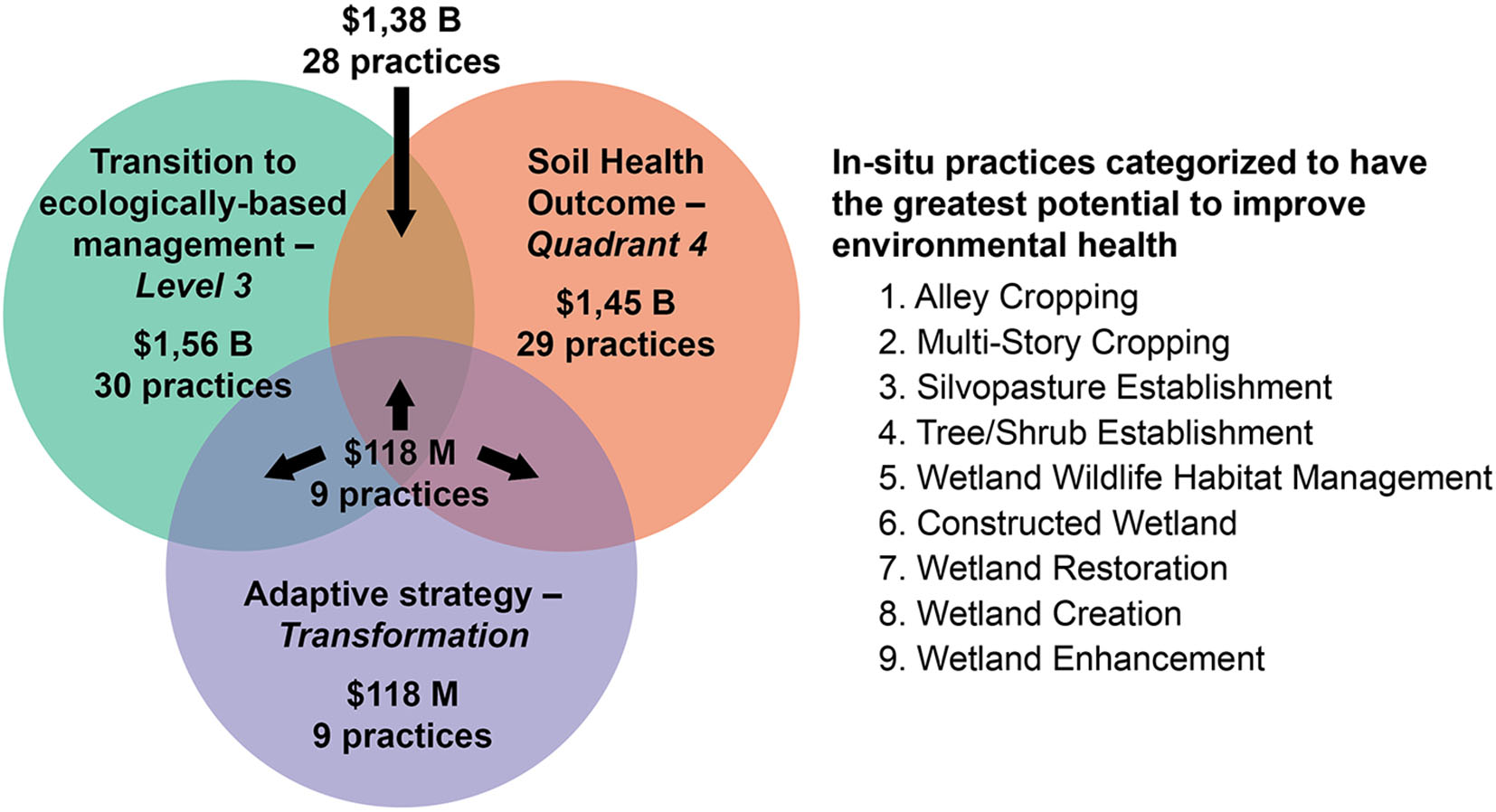 Total invested dollars in the EQIP program from 2009 to 2018 in the classifications and categories having the greatest potential to improve soil health (green), transition to ecologically-based management (orange), and expand adaptive strategy (purple) that were also executed in-situ on managed lands. Overlapping practices meeting multiple top categories and invested dollars are identified in the Venn diagram. Our analysis identified nine overlapping in-situ practices on managed lands in the top categories for our classifications.